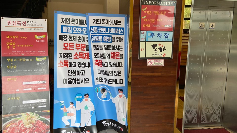 오랜만에 찾은 돈가는 방문객 전원의 체온을 측정하고 방명록을 철저히 작성하였습니다. 발열체크를 철저히 하고 또 베너 안내문을 아래 사진처럼 많이 준비하는 모습에 정말 안심하고 이용할수 있었습니다.