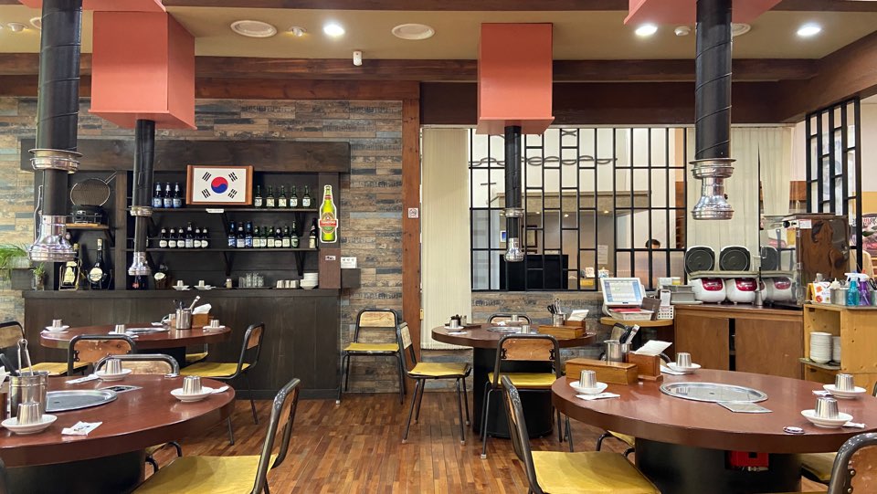 안내받은 홀의 전경입니다. 보통 점심시간보다 일찍 서둘어온 식당이기에 다른 손님들은 없었습니다. 한쪽 벽면을 지키고 있는 태극기가 보입니다. 식당 내부는 전통 고기집과 같지만 깨끗함과 정리된 모습은 담 다른 식당관리를 하고 있으을 입증하는것 처럼 보였습니다.