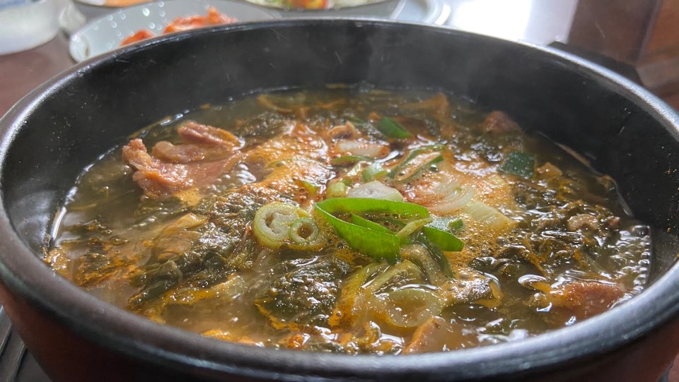 짧은 시간이었지만, 한참이 걸린듯한 기다림이었습니다. 맛있는 우거지해장국이 팔팔끓는 뚝배기 용기에 담겨져 나옵니다. 한눈에 봐도 맛있는 우거지해장국 색과 향이 나옵니다.