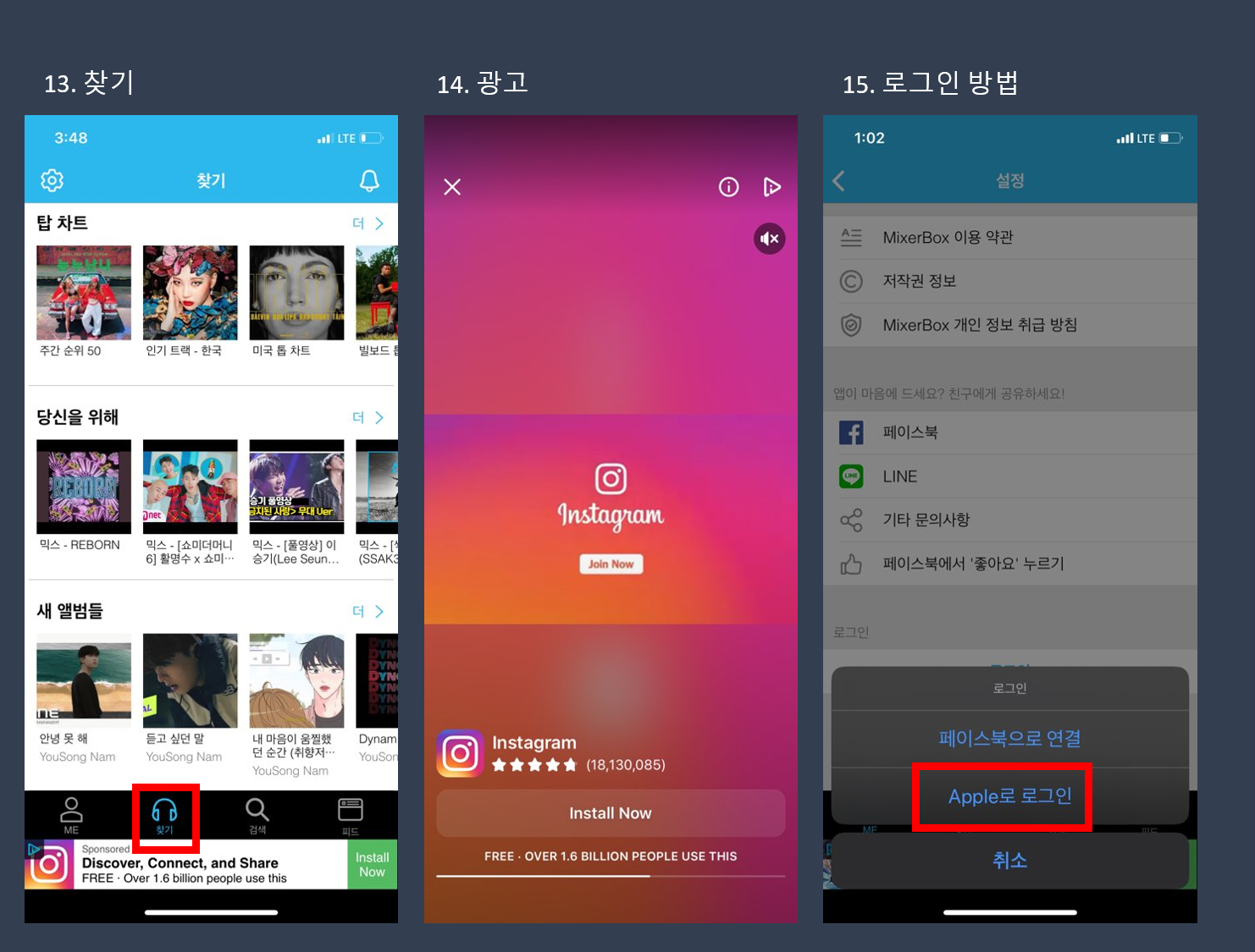 15. 13번 화면에서 좌측상단의 톱니바퀴 버튼을 누르면 믹서박스 로그인 화면이 나옵니다. 믹서박스는 별도의 로그인이나 가입없이 사용할수 있는 무료앱입니다. 다만 회원 가입시 좋은점 하나는 휴대폰을 변경하거나 기기 변경시 내가 저장한 음원이 모두 복원이 된다는 장점이 있습니다. 회원 가입은 애플아이디를 사용하거나 페이스북 아이디로 연동하여 사용하는 방법이 있습니다.
