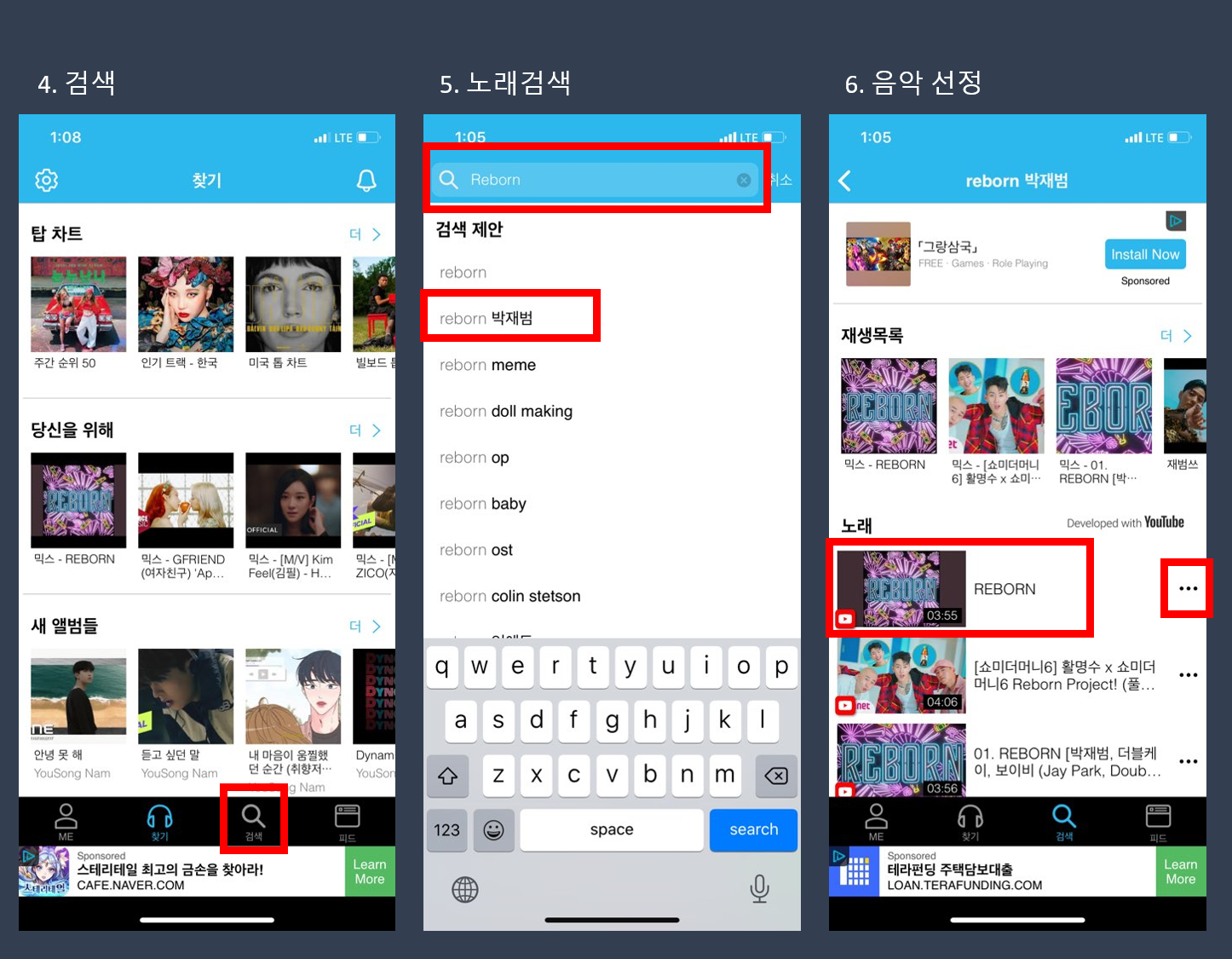 5. 화면이 노래검색 창으로 변경되면, 화면 상부의 돋보기 아이콘이 있는 검색창에 워하는 노래 제목을 입력합니다. 저는 예스파파님이 추천하신 "Reborn"을 입력하였습니다. 입력결과는 "Reborn"과 "Reborn 박재범"이 나왔습니다. 저는 Reborn 박재범을 클릭 하였습니다.