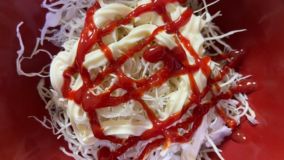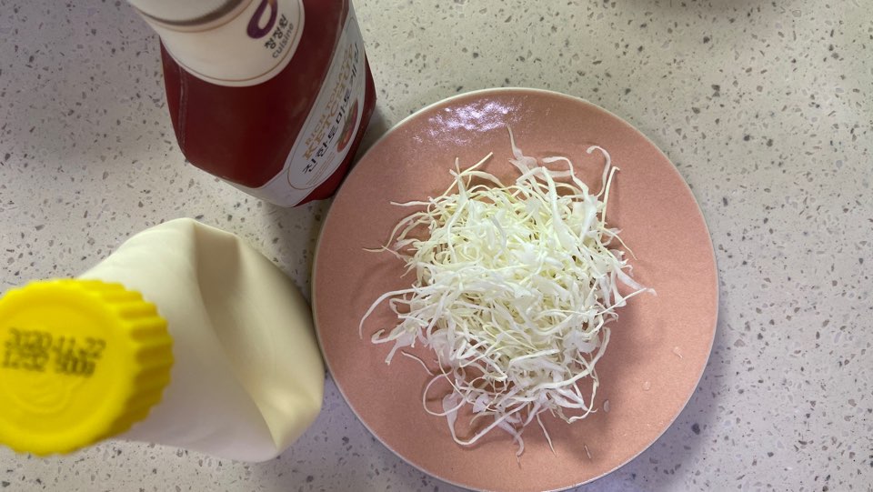 빛깔이 좋은 양배추 샐러드입니다. 마요네즈와 케찹을 잘 비벼주니 참 맛이 좋은 양배추 샐러드로 변신을 했습니다.