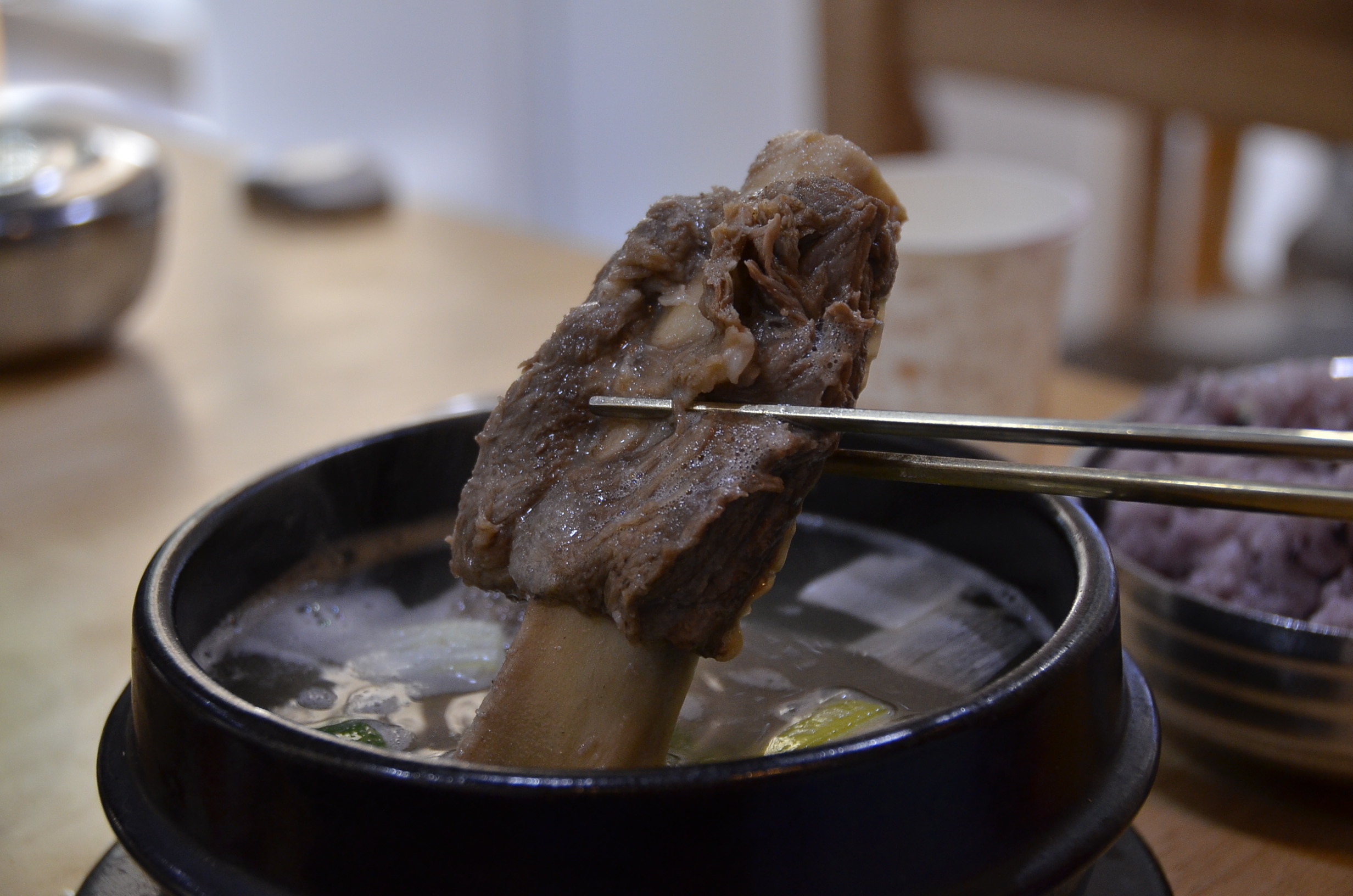 갈비탕에 들어간 갈비도 젓가락으로 들어서 보여줍니다. 사진으로 잘 담아 블로그에 포스팅할수 있도록 들어주는 친절한 아내입니다. 부드러운 고기가 뼈에서 잘 분리가되어 양념장에 찍어 먹습니다. 갈비탕에는 큰 갈비 두대가 들어가 있습니다. 고기한점을 아들과 저에게 나눠서 주는데 완전 부드럽고 맛이 좋습니다. 다음에 갈비팅 주문할것을 심각하게 생각해봐야 하겠습니다.