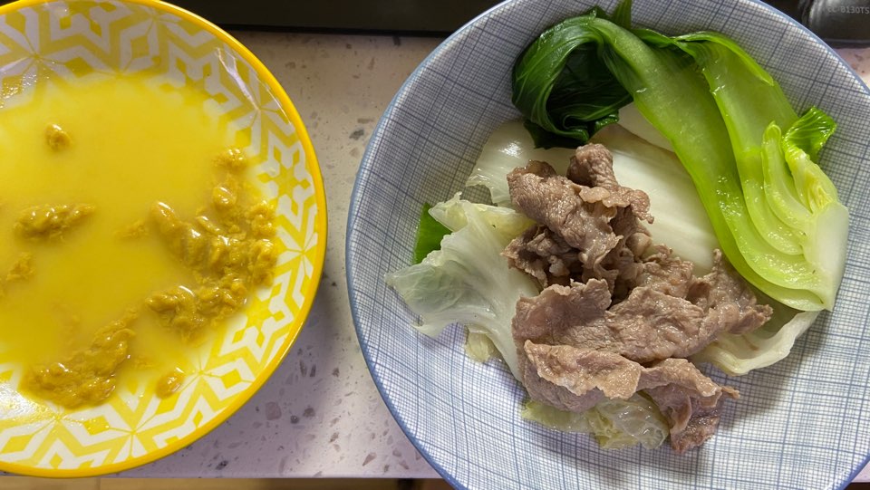 ▼ 아직 덜 섞였지만 그냥 먹어도 좋은 식초겨자소스와 청경채, 등심, 배추가 보이는 제 앞접시의 샤브샤브입니다.