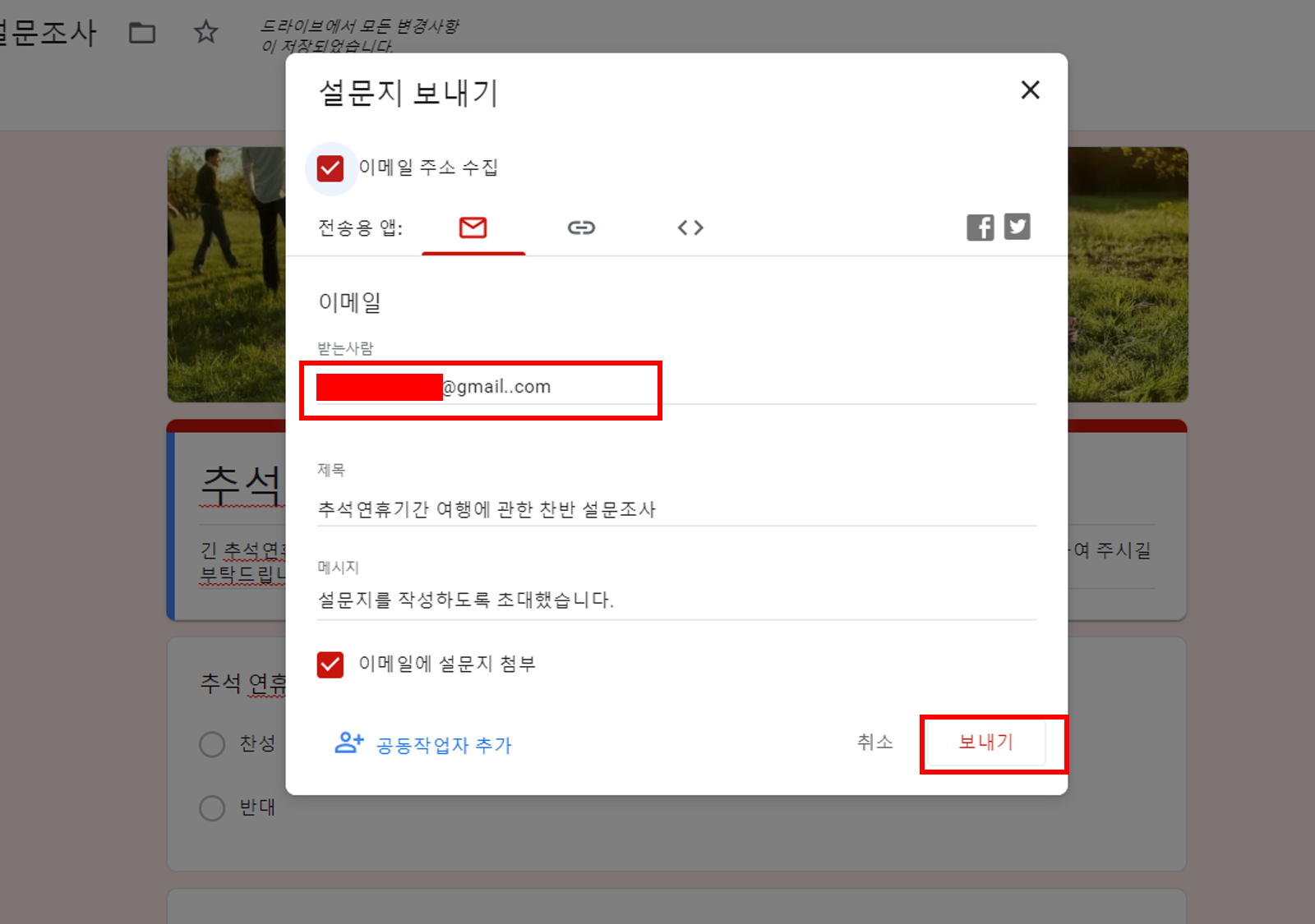 ▼ 보내기 버튼을 클릭하면 아래와 같이 설문지 보내기 화면으로 전환됩니다. 이메일란에 받는사람의 구글 이메일을 기입하면됩니다. 저는 아들과 아내에게 송부하였습니다. 이메일 주소를 바르게 기입한지 확인후 보내기 버튼을 누릅니다.