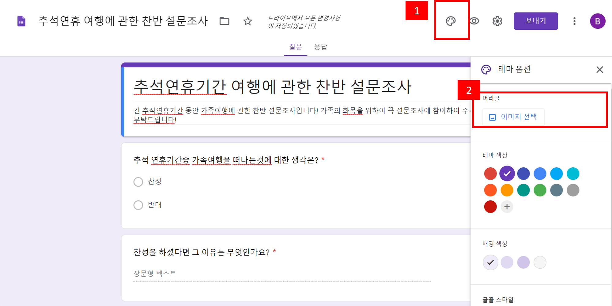 2. 저는 머리글에 이미지를 넣어 좀 부드럽고 답변자가 흥미를 가지도록 하려고 합니다. 2번의 이미지 선택을 클릭합니다.