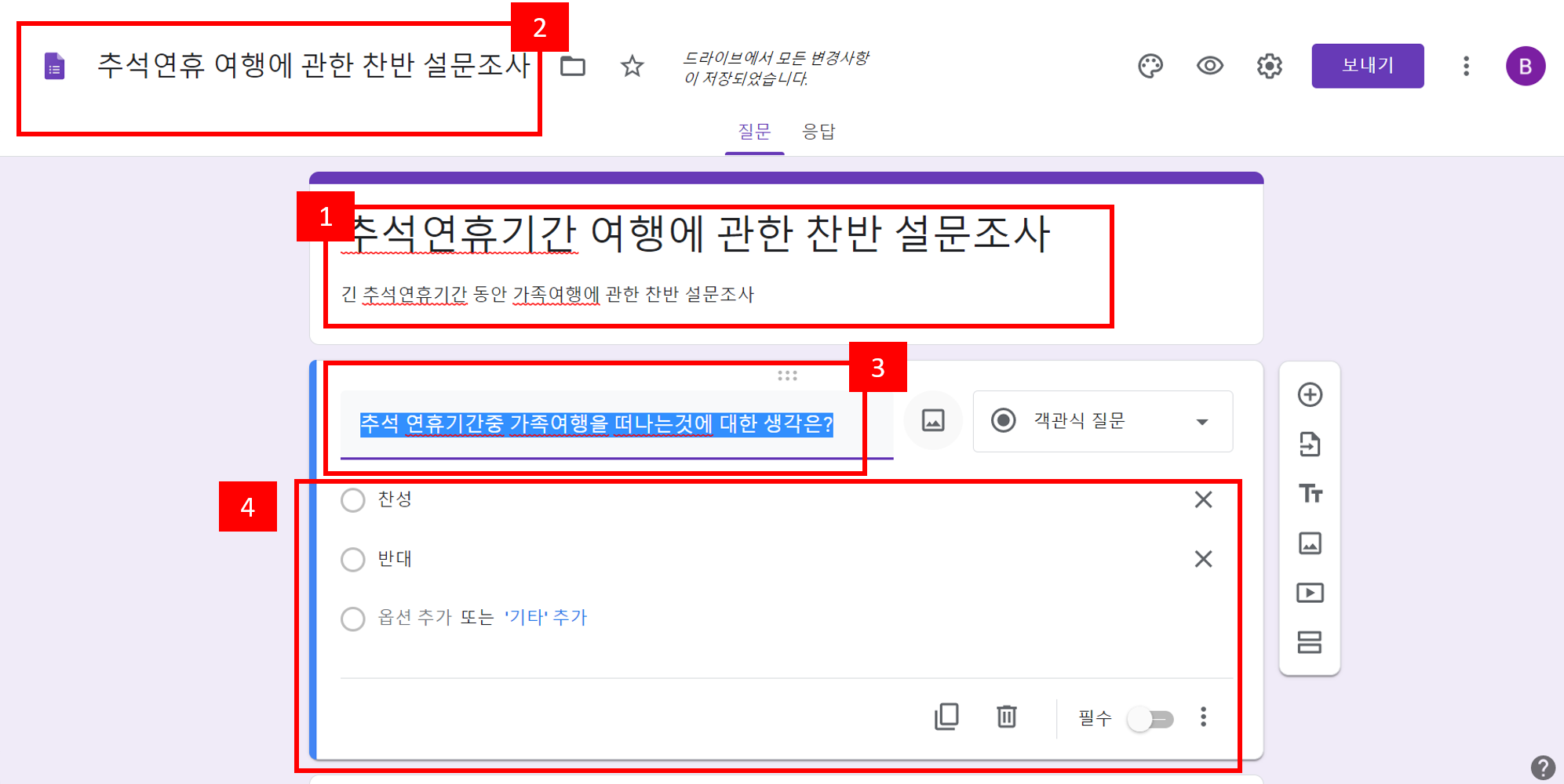 2. 상단의 설문지 양식 제목도 동일하게 기입을 하여줍니다.