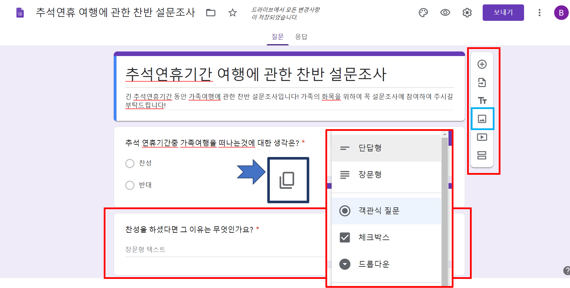 ▼ 위 찬반 객관식 질문에 대한 추가 질문인 주관식 질문을 만들었습니다. 기존 객관식 질문 중앙에 위치한 아래 그림의 파란색 박스 복사 그림을 클릭합니다. 질문을 추가로 만든 후 질문에 유형을 선택합니다. 저는 장문형 질문을 선택하였습니다.