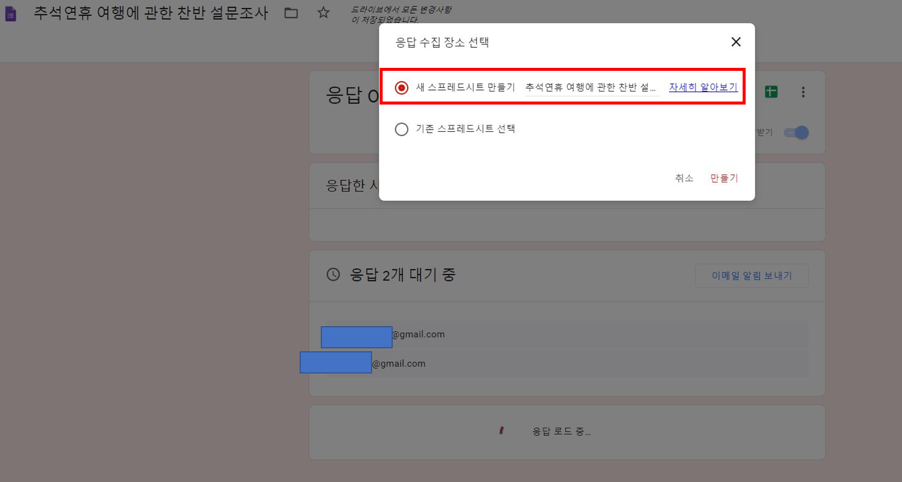 ▼ 마지막으로 설문에 답한 사람들의 답변을 수집할 문서를 선택하여야 합니다. 새로운 설문임으로 새 스프레드시트를 만들기를 설정하여 만들기를 눌러줍니다. 화면의 아래부분을 보면 설문조사 대상자들이 아직 응답을 하지 않은것을 확인할수 있습니다.
