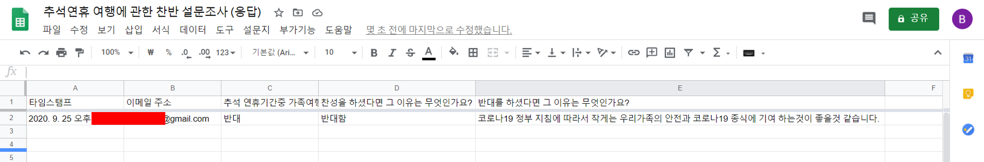 ▼ 아래와 같이 설문지에 대한 답변이 왔습니다. 설문조사 결과 저희가족은 추석연휴에 집에만 있기로 하였습니다.