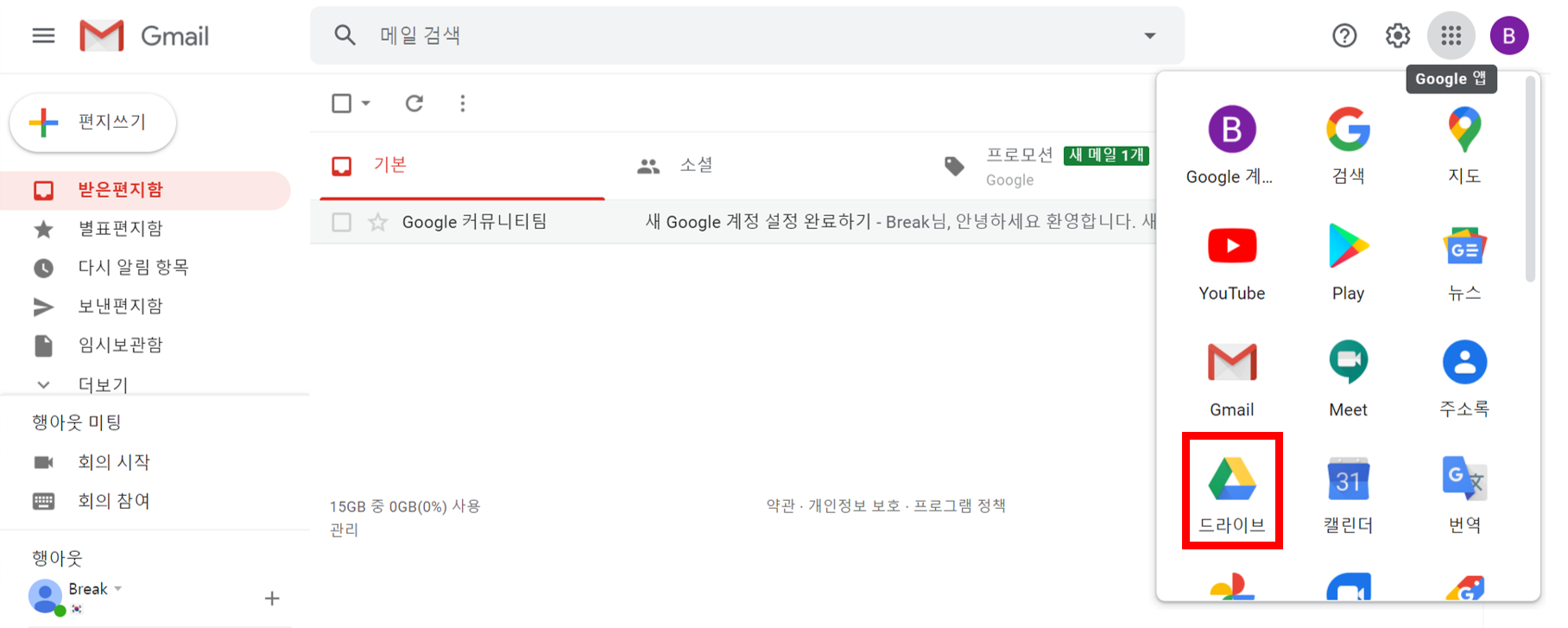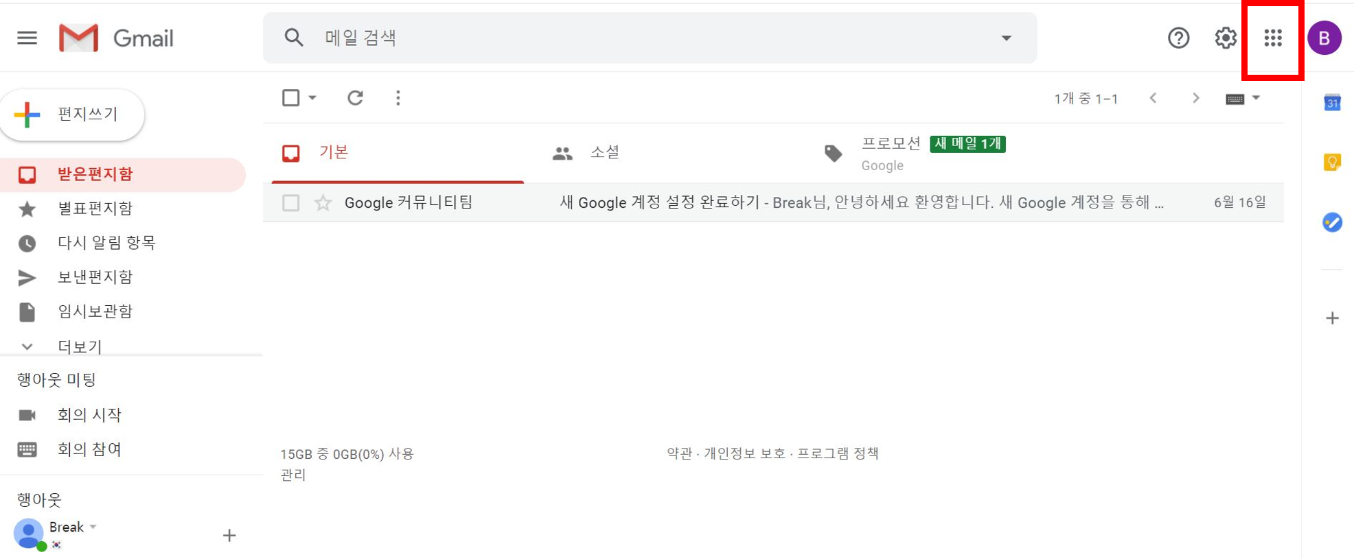 ▼ 늘 구글 프로그램을 사용하기 위하여 이메일 계정에 로그인한 후 프로그램 제반 서비스인 아래 사진의 우측 상단에 있는 회색점 9개를 클릭합니다.
