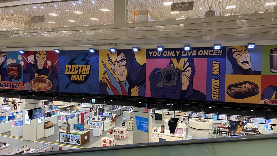 ▼ 지하층으로 내려가는 에스컬레이터 천정에 일렉트로마트 마스코트 일렉트로맨이 질주하는 이미지가 걸려있습니다. 환영하는 모습이 꼭 빨리 전자기기 매장으로 뛰어가라고 하는 것 같습니다.