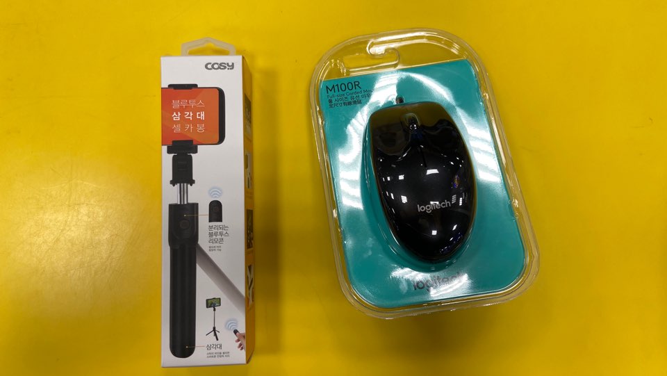 일렉트로 마트에서 구입한 아들의 핸드폰 삼각대와 마우스입니다.