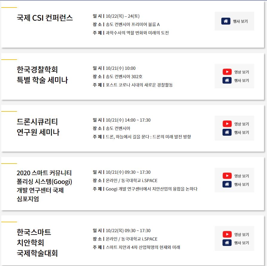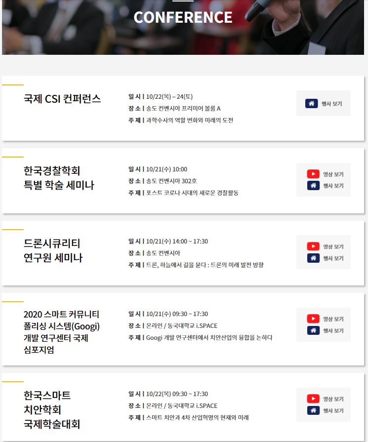 ▼ 특히나 관심이 있었던 컨퍼런스들이었습니다. 회사에 사전 승인을 받고 온라인 컨퍼런스에 좋은 강연들을 들었습니다. 특히 포스트 코로나시대에 경찰활동들 관련 컨퍼런스에서는 대한민국에서 살고 있는것이 다행이라는 생각이 들정도로 미리 준비하는 모습들을 볼수 있었습니다. 지금도 회원가입을 하시면 국내치안산업 관련하여 관심이 있는분들은 컨퍼런스 영상을 보실수 있으니 참고하시기 바랍니다.