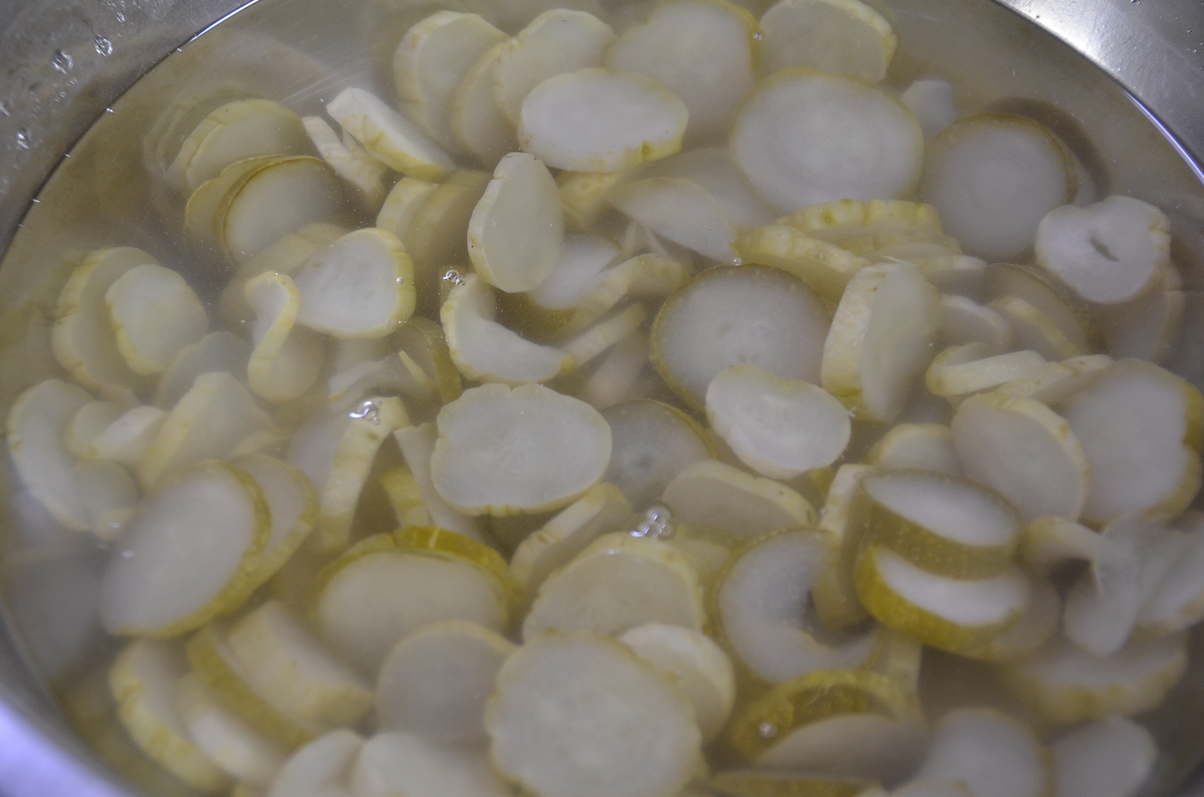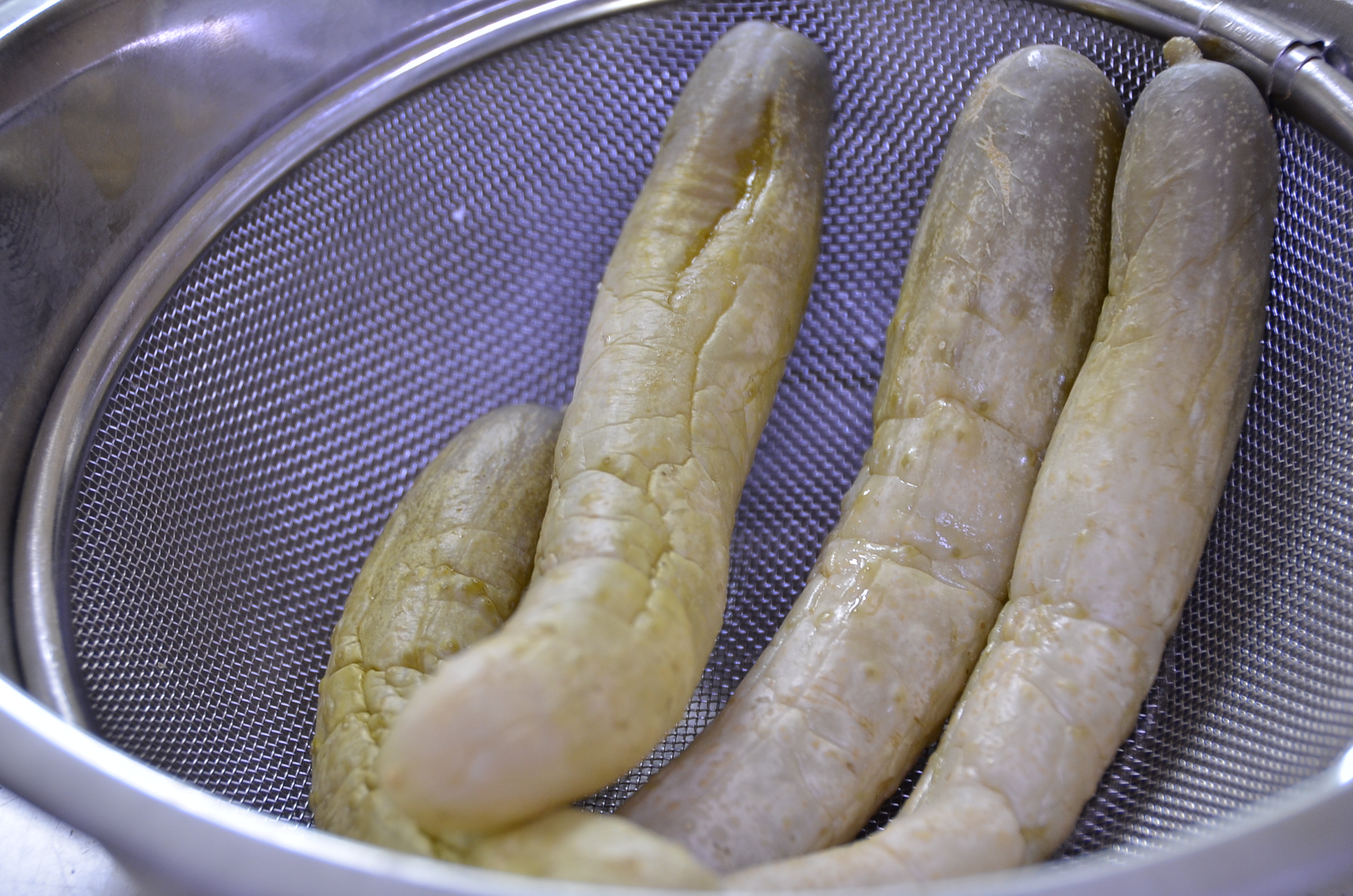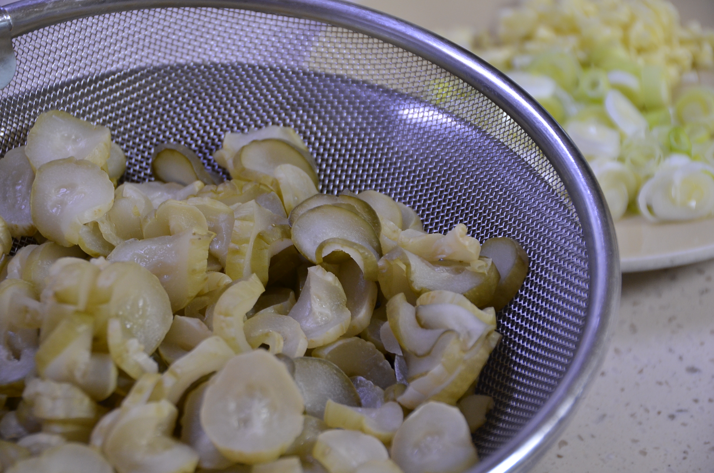 ▼ 오이지를 냉수에서 꺼내어 물기를 꼭 짜서 채에 올려놓고 물기를 한 번 더 빼어줍니다. 물기를 잘 빼는 것이 맛의 비결이 될 정도이니 오니지를 꽉 짜줍니다.