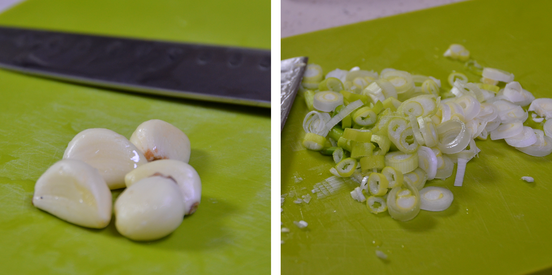 ▼ 짠맛을 빼는 동안에 오이지에 들어갈 부재료를 추가합니다. 좌측의 사진과 같이 생마늘을 반주먹 가지고와 마늘을 다집니다. 우측 사진은 파입니다. 파를 잘게 잘라줍니다.