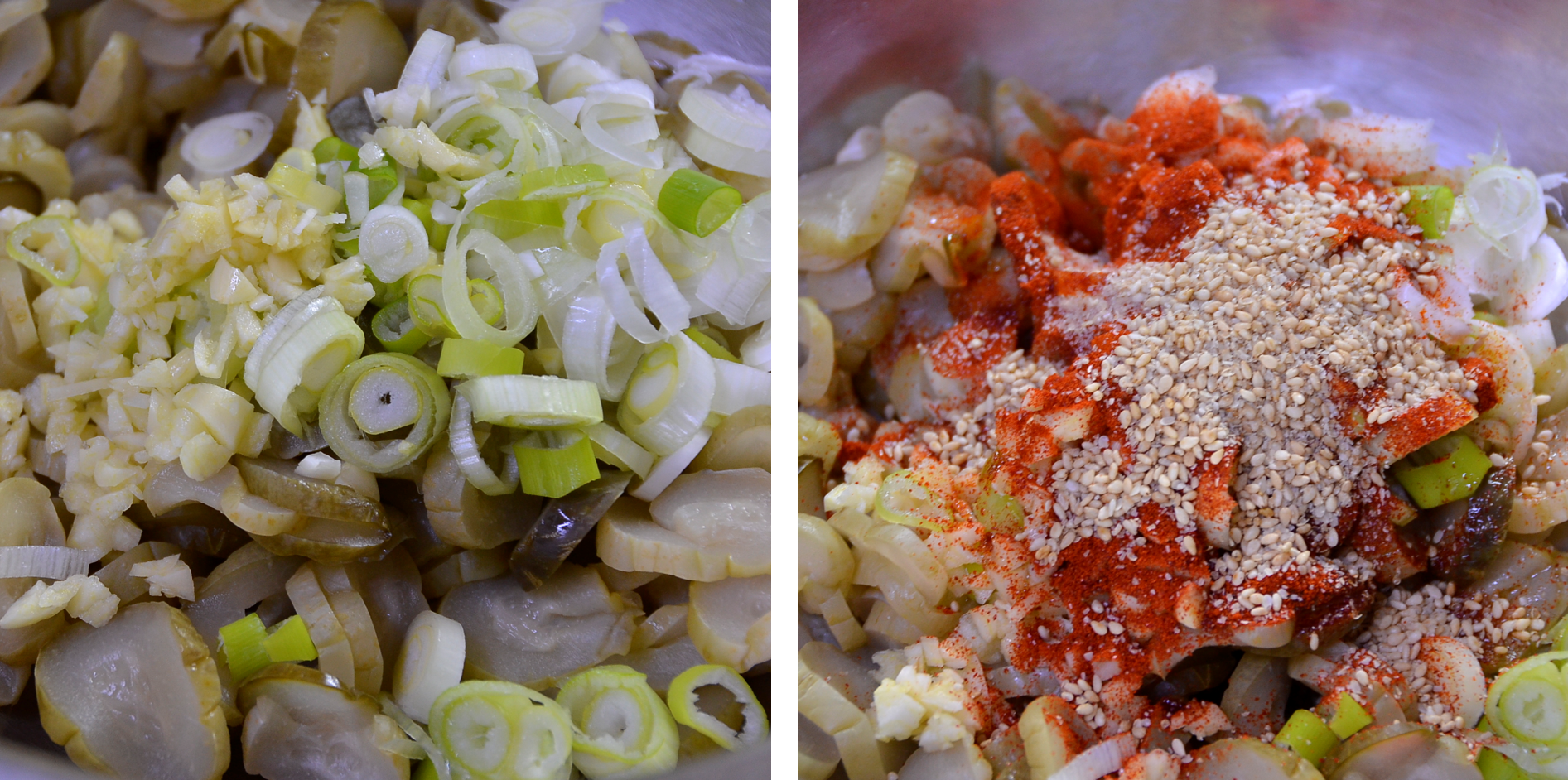▼ 물기를 다 빼어준 오이지 위에 다진 파와 마늘, 고추가루 듬뿍, 깨 그리고 마지막으로 참기름을 듬뿍 뿌려줍니다.