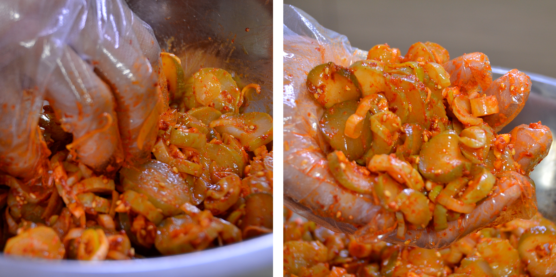 ▼ 잘 섞어준 오이지 무침을 반찬 용기에 올려줍니다. 다 만든 오이지무침에 가족들을 주방으로 소환하여 한 점씩 입에 넣어줍니다. 아내와 아들 녀석이 좋아합니다. 엄지손가락을 또 올려주는 이 두 사람 때문에 주말에 힘들어도 반찬 만들기를 멈출 수가 없습니다.