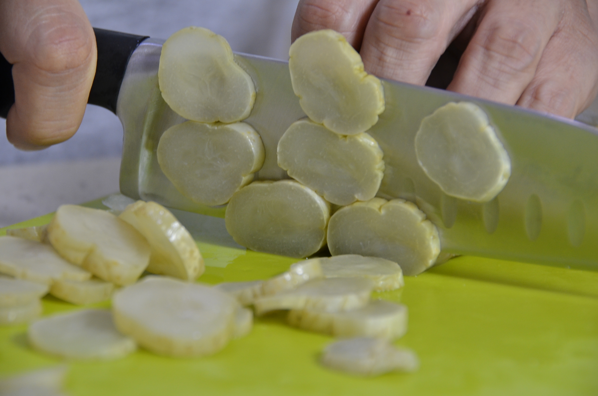 ▼물기를 1차적으로 빼어준 오이지를 먹기 좋은 크기로 잘라줍니다. 저희 집은 잘게 자르는 것을 좋아해서 얇게 자르려고 노력을 했습니다.