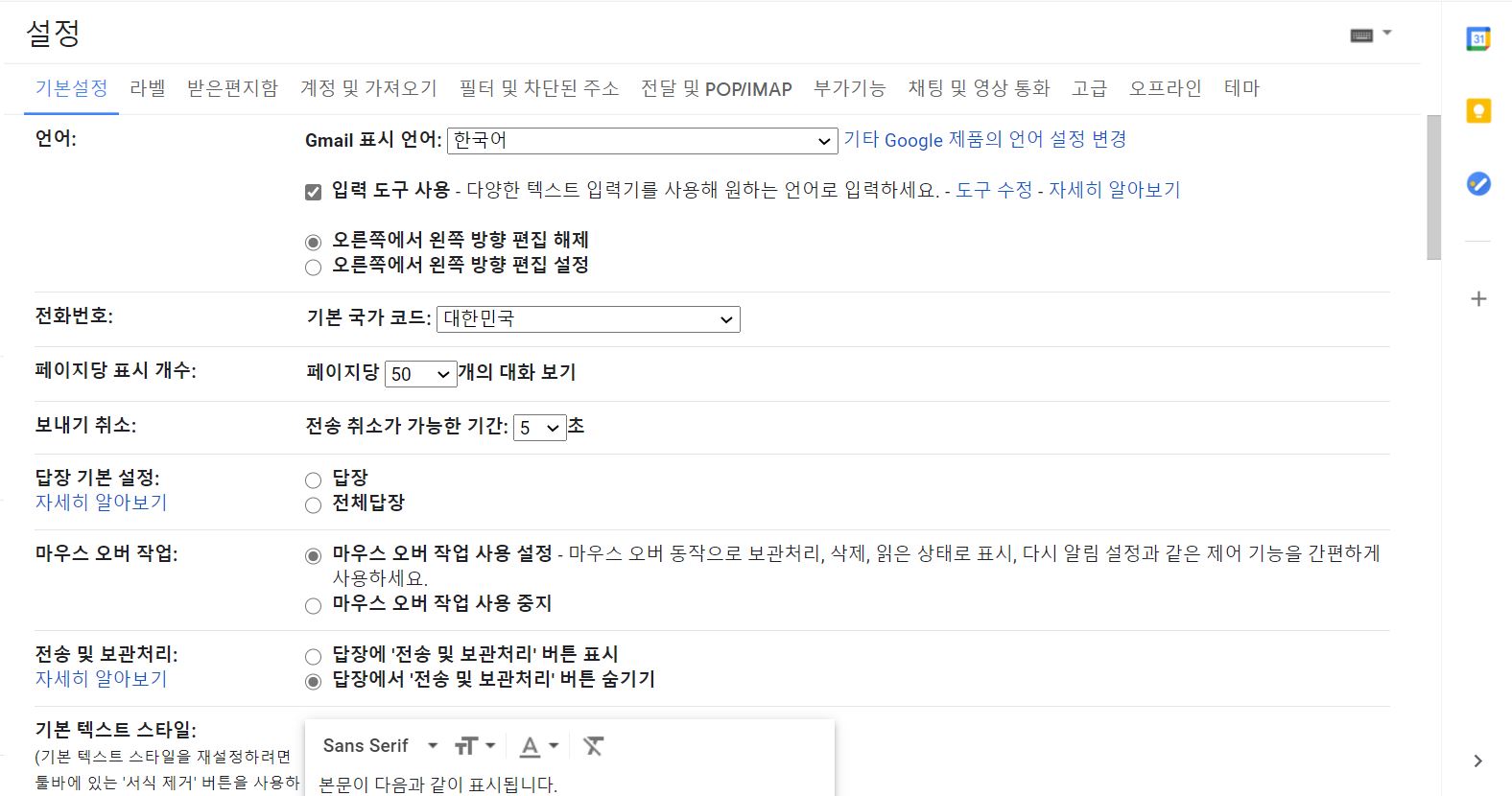 ▼ 설정 화면이 펼쳐집니다. 설정 항목이 다양하고 많습니다. 이중 서명은 거의 하단에 위치하고 있음으로 스크롤바를 내려 서명을 찾습니다.