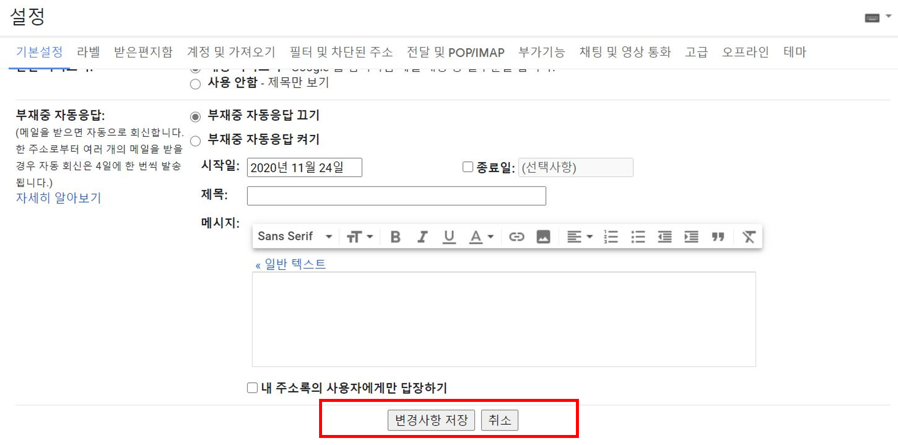 ▼ 마지막으로 가장 중요한 항목이 남아 있습니다. 그것은 바로 변경사항 저장입니다. 변경사항 저장 버튼을 누르지 않고 그냥 넘어갈 시에는 열심히 세팅한 서명이 이메일 세팅에 남아있지 않을 수 있으니 주의하여야 합니다.