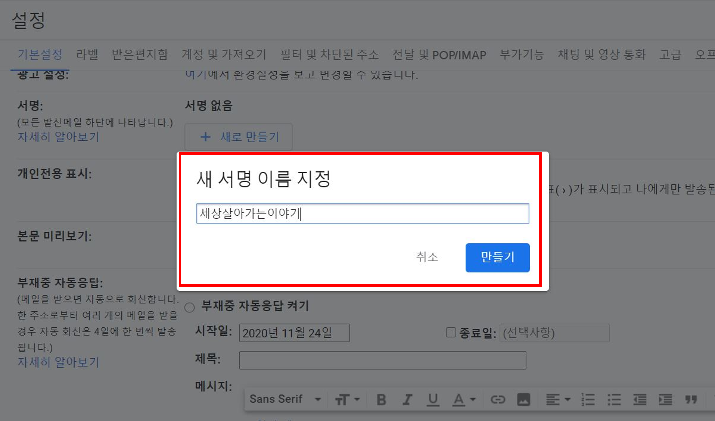 ▼ 새로 만들기를 누르니 아래 붉은색 박스와 같이 새 서명 이름을 지정하는 창이 뜹니다.