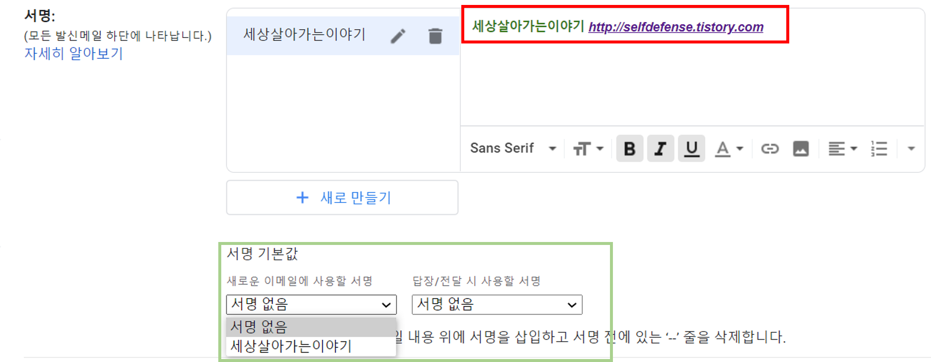 마지막으로 하단의 서명 기본값을 설정합니다. 서명 없음 우측의 화살표를 클릭하여 원하는 서명을 사용합니다.