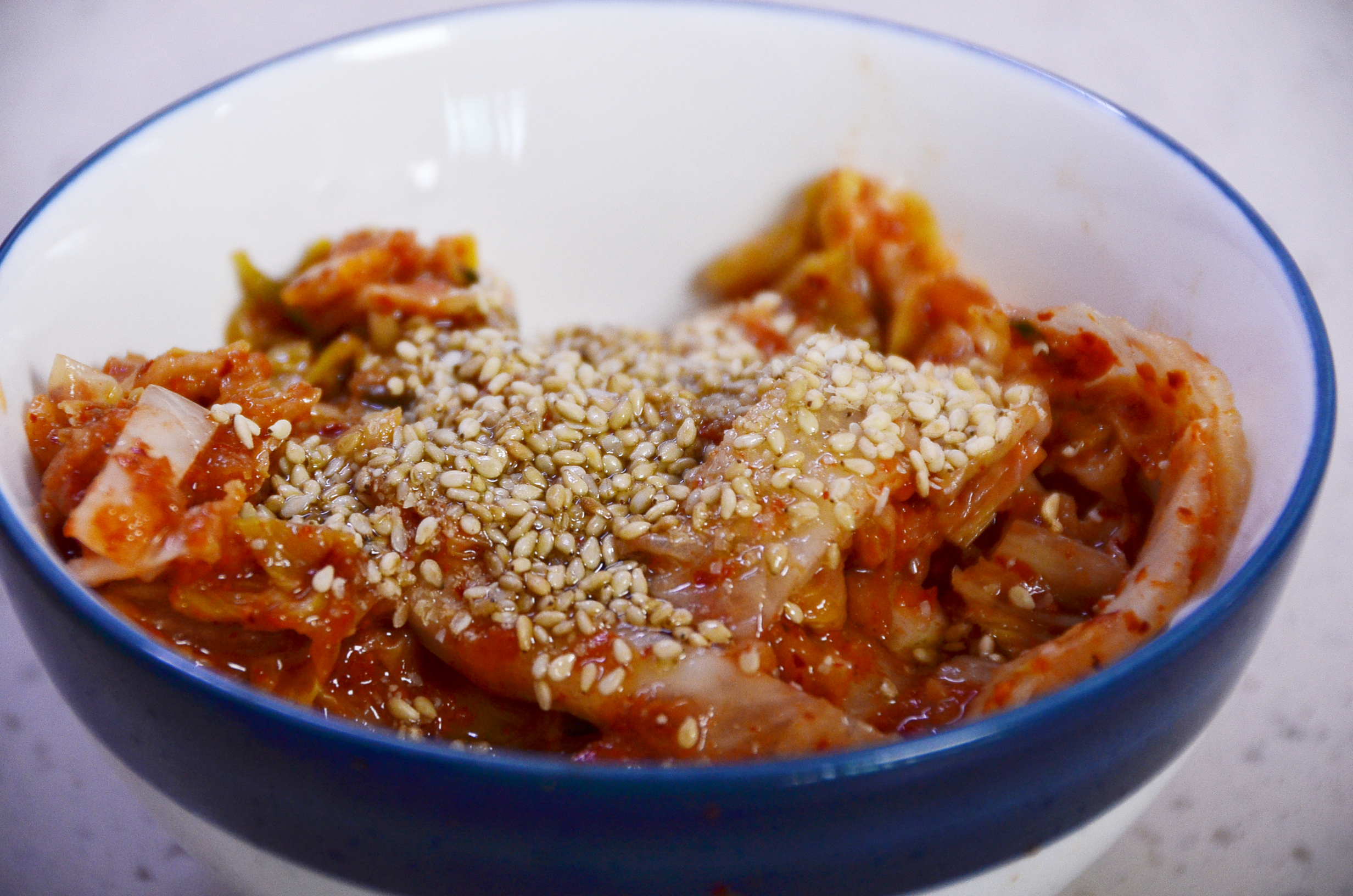김치를 밥공기 하나가득 넣고 잘게 잘라줍니다. 그위에는 참기름 적당량과 깨소금을 넣어 고소함을 더해줍니다.