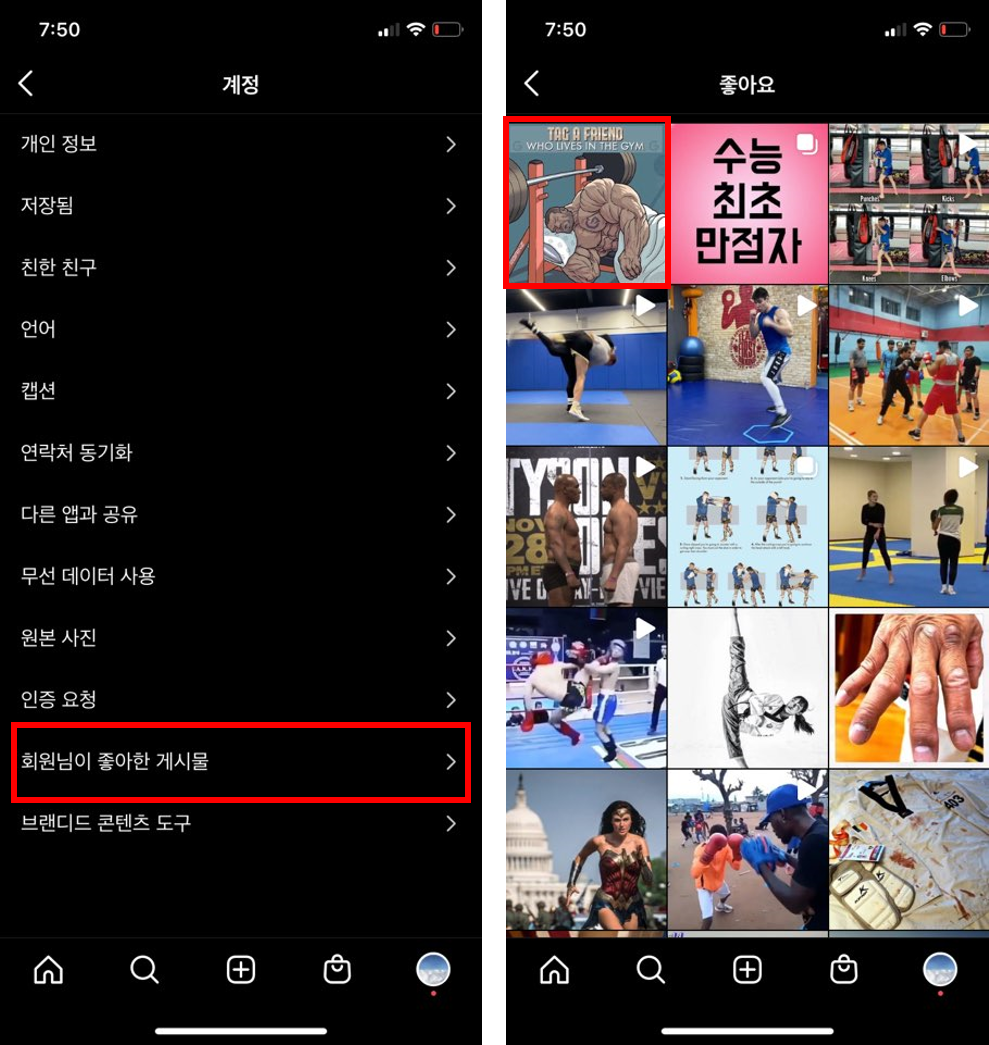 6. 아래 좌측 화면과 같이 계정 화면에서 회원님이 좋아한 게시물을 클릭합니다.
