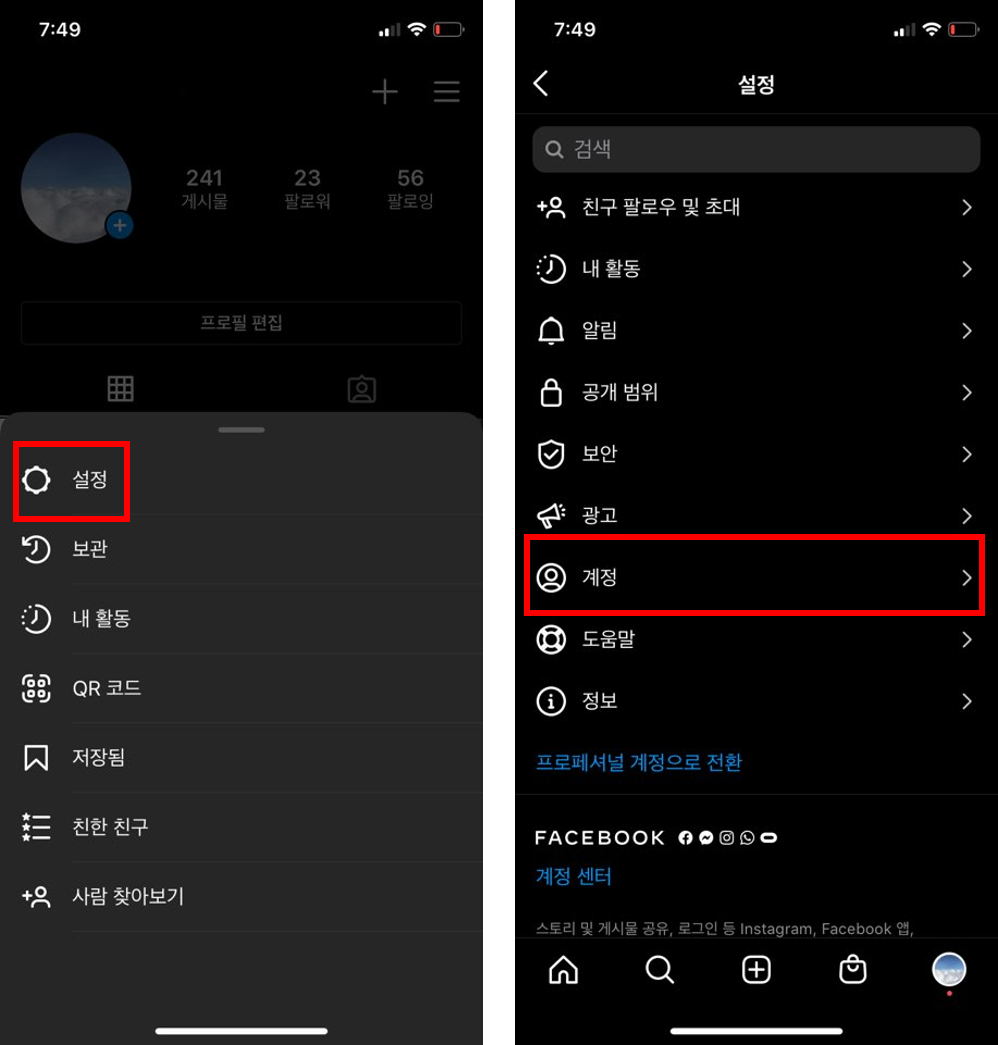 4. 아래 좌측 사진과 같이 인스타그램 설정을 클릭합니다.