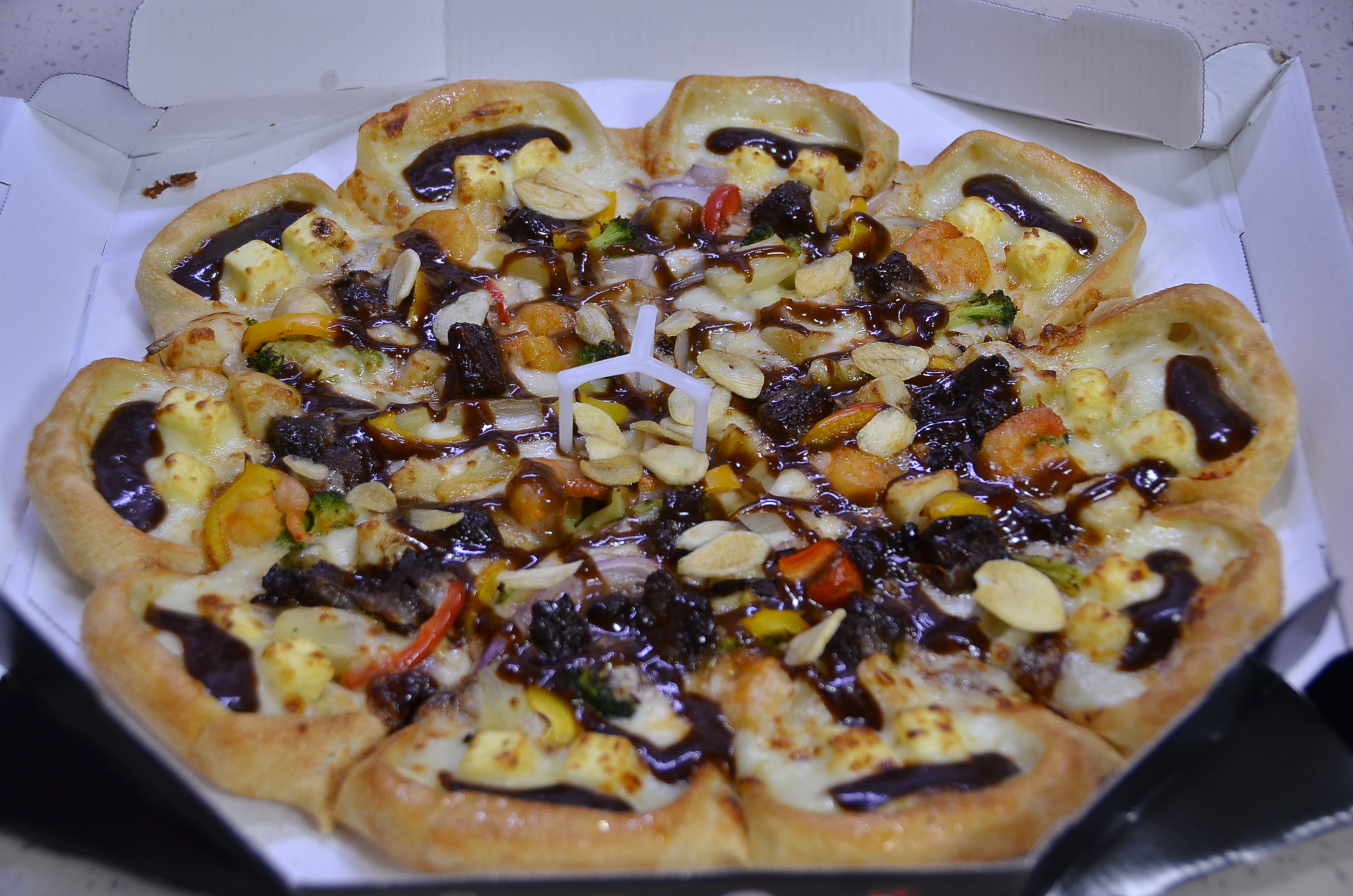 저는 큰 기대 없이 피자 뚜껑을 엽니다.
