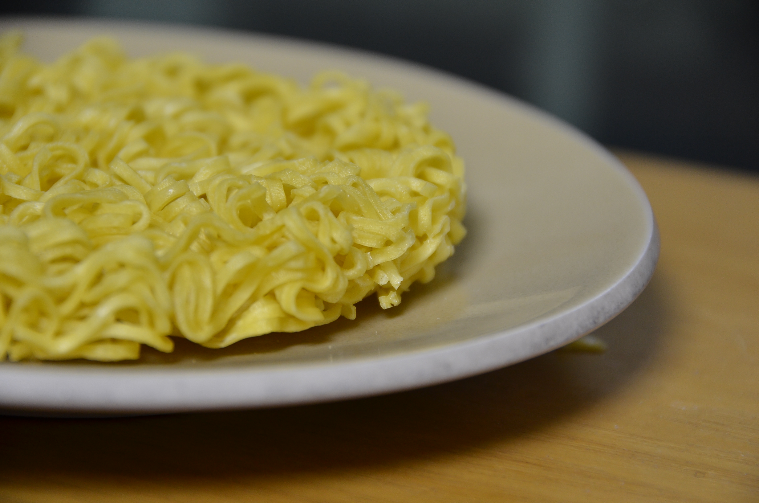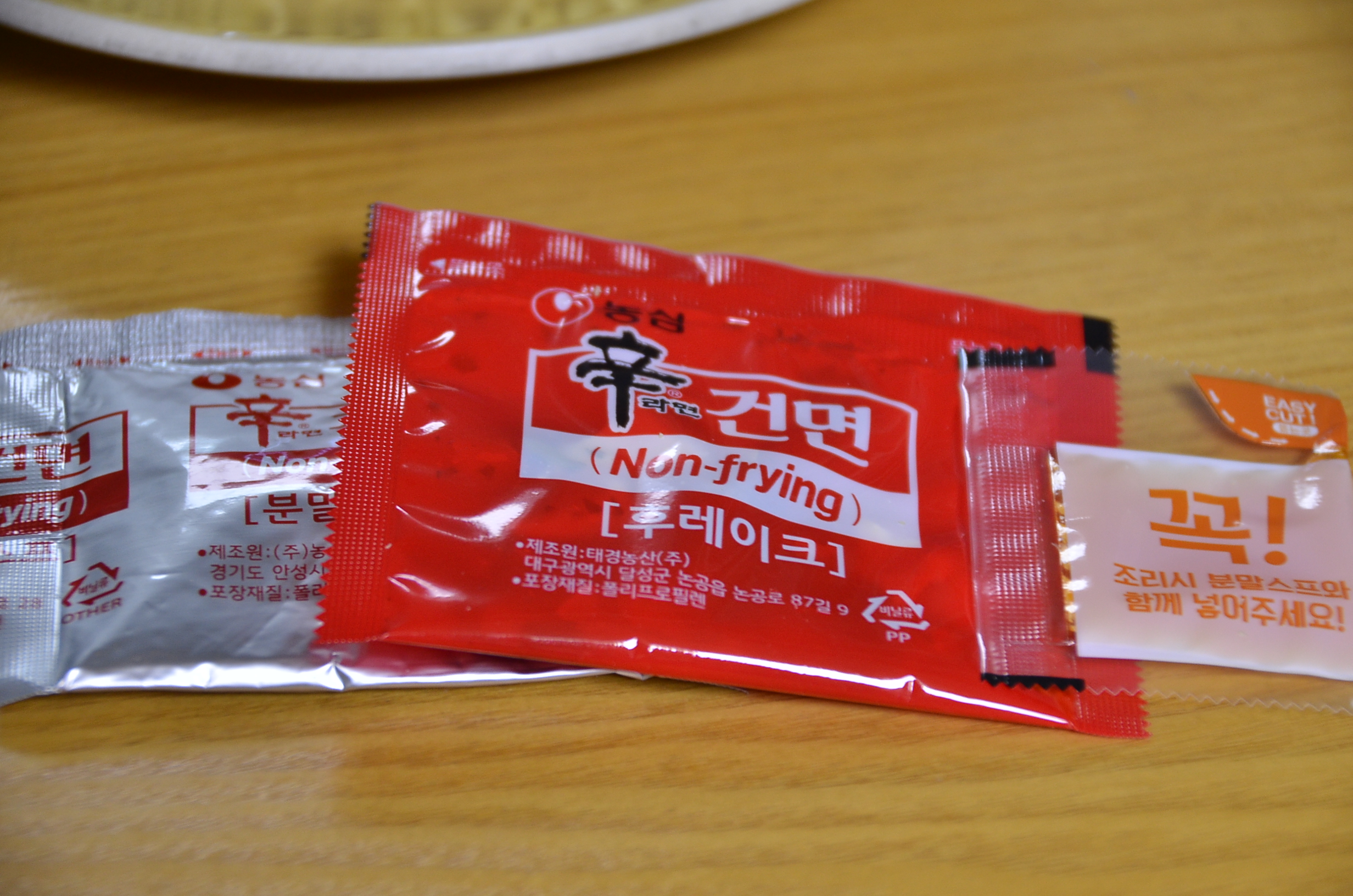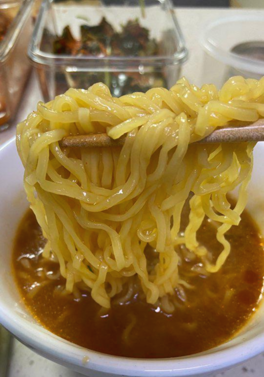 노랑 빛깔을 띄우고 면발은 더 많이 휘어져 있으며 얇아 보입니다.