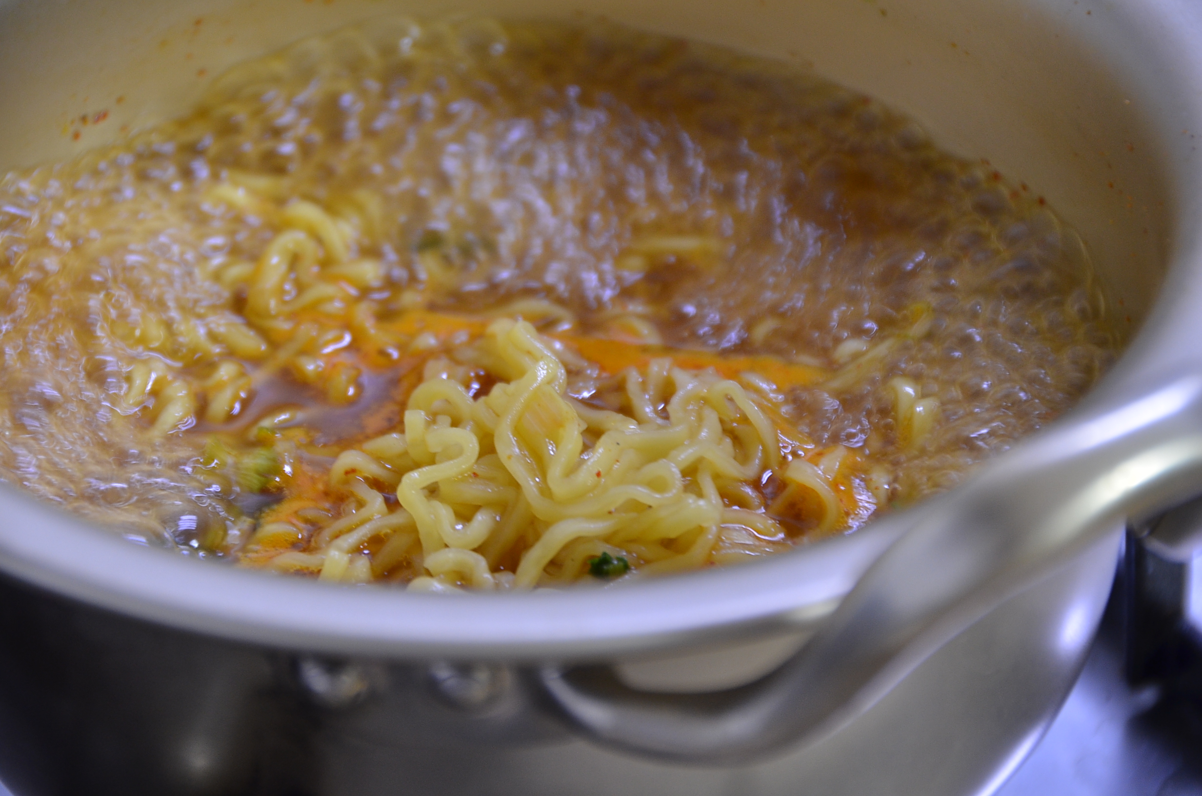 끓는 물에 면을 넣는데 면이 바로 냄비 바닥으로 갈아 앉아버립니다. 느낌이 기타 다른 라면들과 다릅니다.