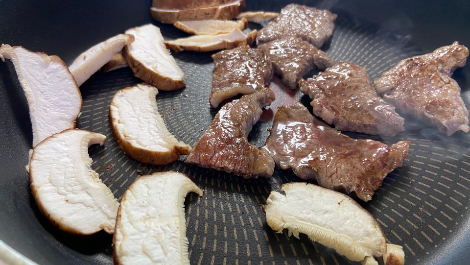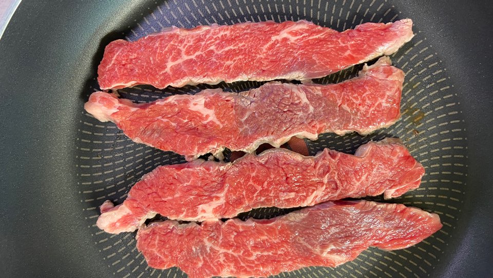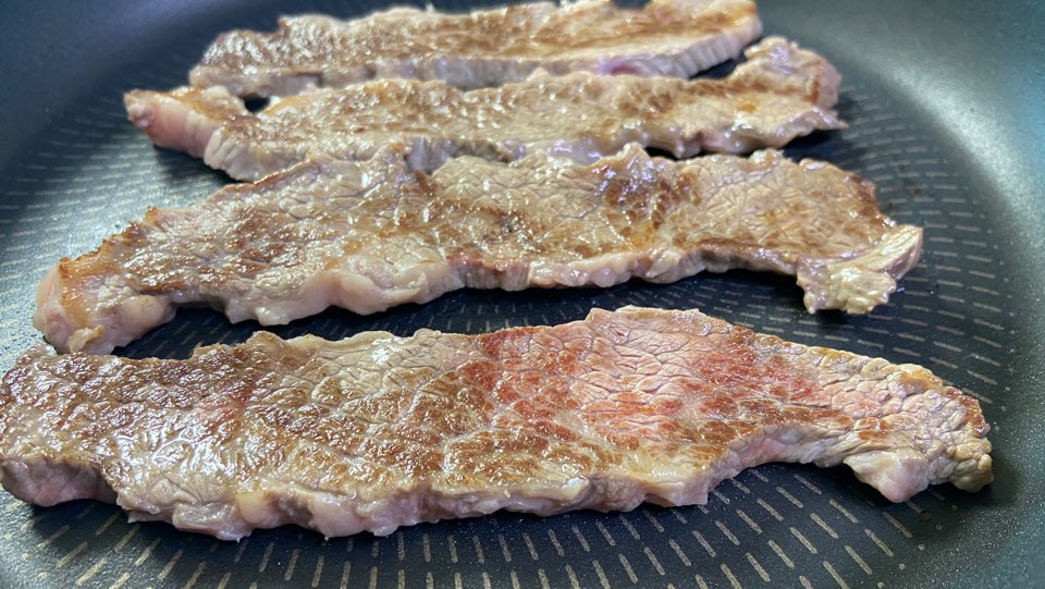 ▼ 갈비살이 잘 익을수 있도록 팬을 먼저 한참 가열합니다. 팬에 열기가 올라오자마자 갈비살을 올리니 바로 고기 굽는 냄새가 코 끝에 전달되어집니다.