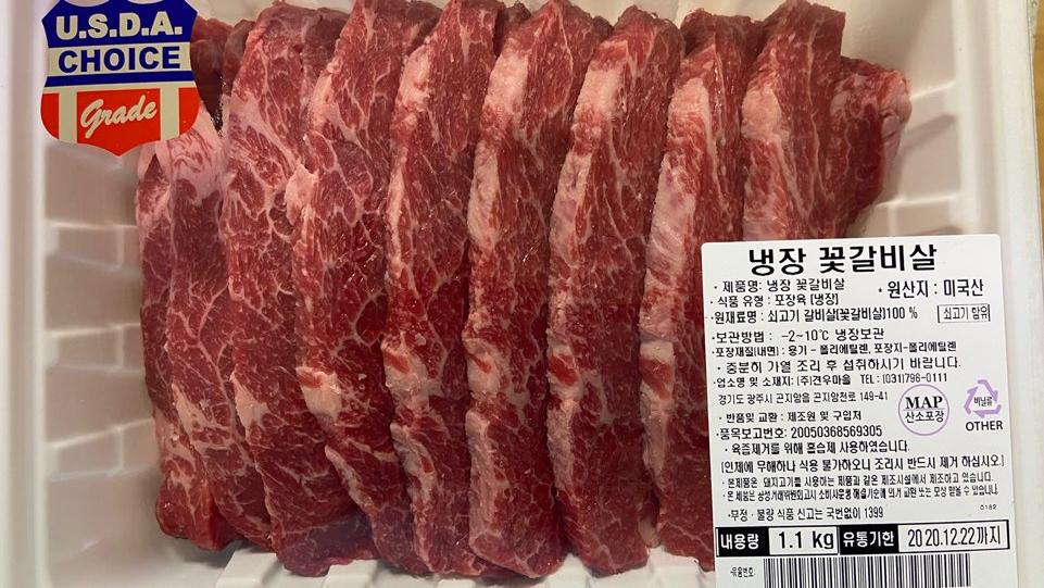 포장의 비닐을 걷어내어 보니, 꽃 갈비살 고기내 마블링이 곱고 예쁘게 잘 퍼져있습니다.