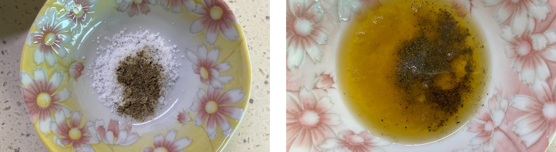 ▼ 고기맛 아는 아내와 아들녀석의 취향때문에 하나는 소금과 후추만을 준비하고 다른 하나는 참기름까지 추가한 기름장을 준비하였습니다. 저는 개인적으로 참기름이 들어간 것이 더 좋습니다.