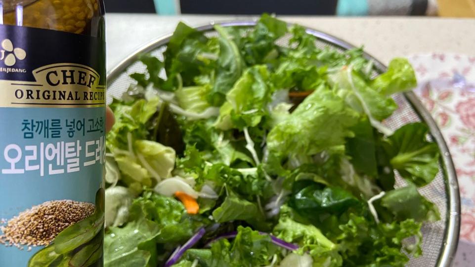 아들녀석이 오리엔탈 드레싱이 뿌려진 야채와 삶은 계란을 먹더니 맛이 좋다며 아주 좋아합니다.