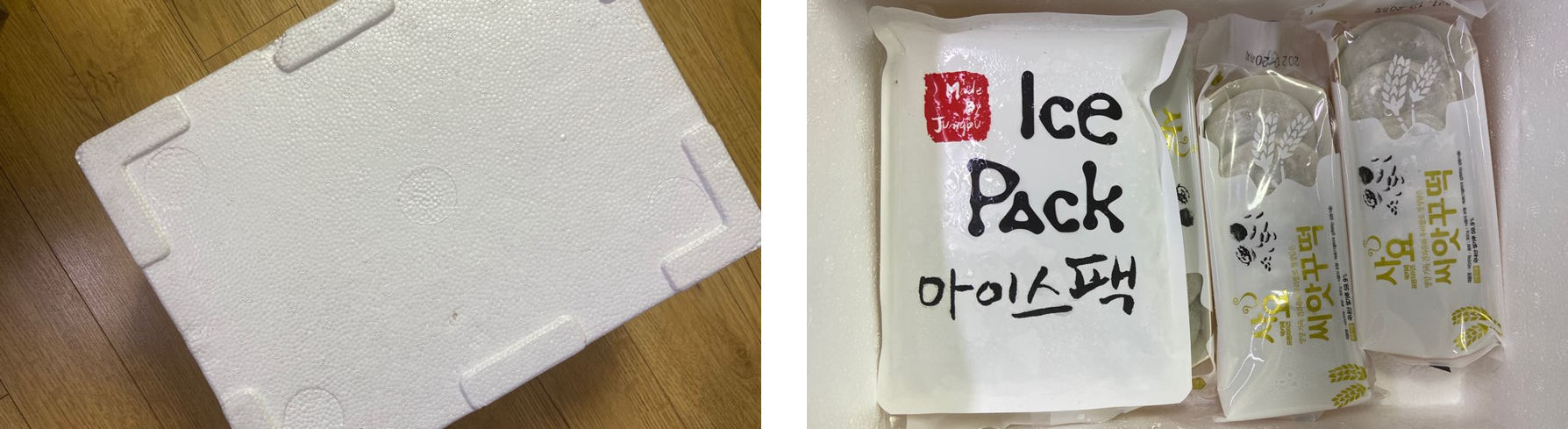 꼼꼼히 밀봉된 테이프를 제거하고 박스를 열어보니, 아이스팩 문구가 예쁘게 잘 디자인된 아이스팩과 함께 씨앗꾸떡이 보입니다.