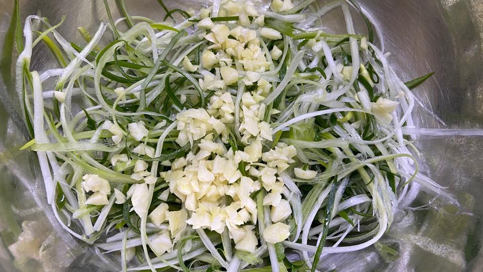마늘 다지기는 저의 전문입니다. 마늘 세 쪽을 다져 물기를 빼낸 파채 위에 올립니다.