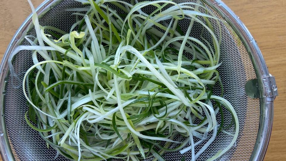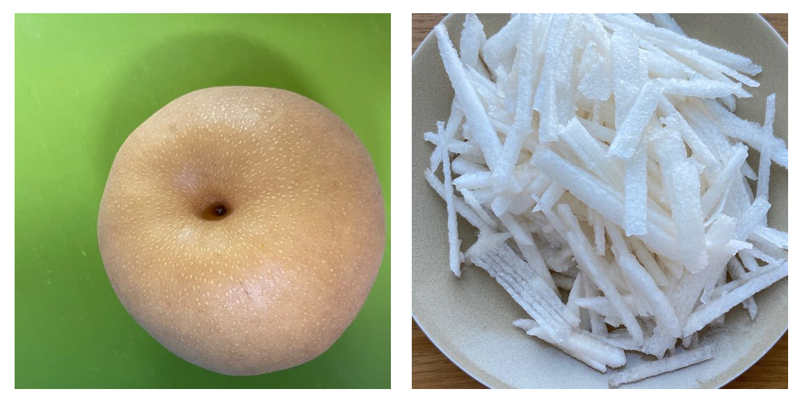 파채는 단골 정육점에서 얇게 채를 썰어줍니다. 한 번 더 흐르는 깨끗한 물에 세척을 하여 채반에 올려 물기를 빼내어줍니다.