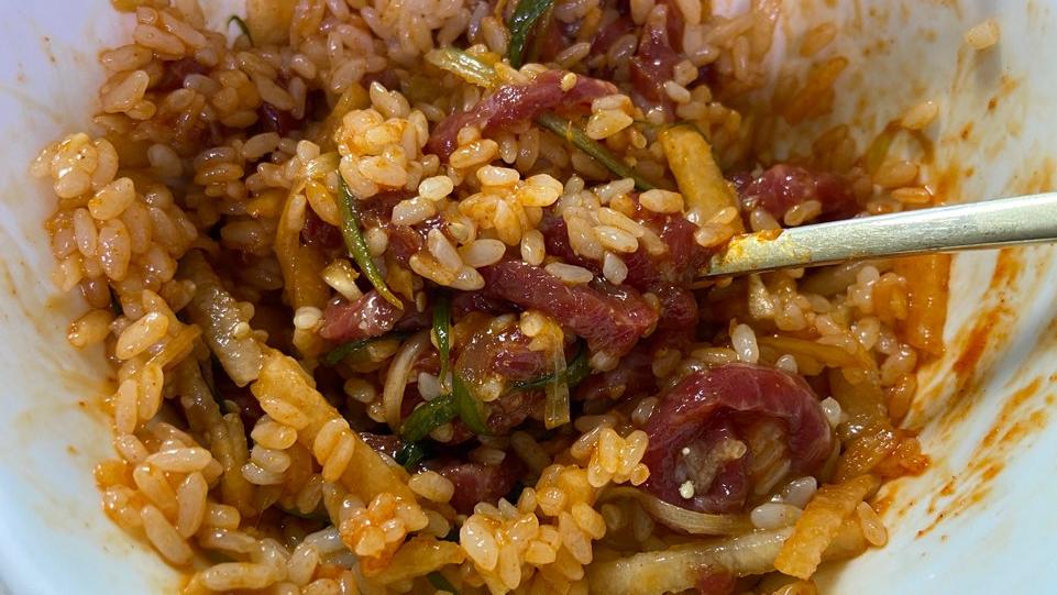 육회 무침을 먹을 때 빼먹을 수 없는 한가지 바로 육회 비빔밥입니다. 먹을줄 아는 아들녀석이 먼저 육회 비빔밥을 만들어 먹는데 도저히 나중에 먹을수 없어 저 또한 따라 비빔밥을 만듭니다.