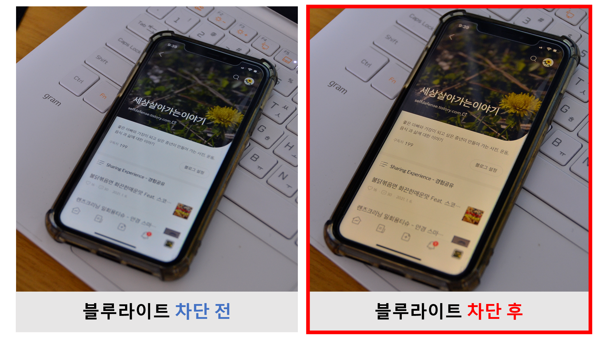 아래 사진은 블루라이트 차단 전후 사진입니다. 블루라이트 차단 안경을 쓰지 않고 핸드폰을 봤을 때도 눈에 오는 불편함이 없습니다.