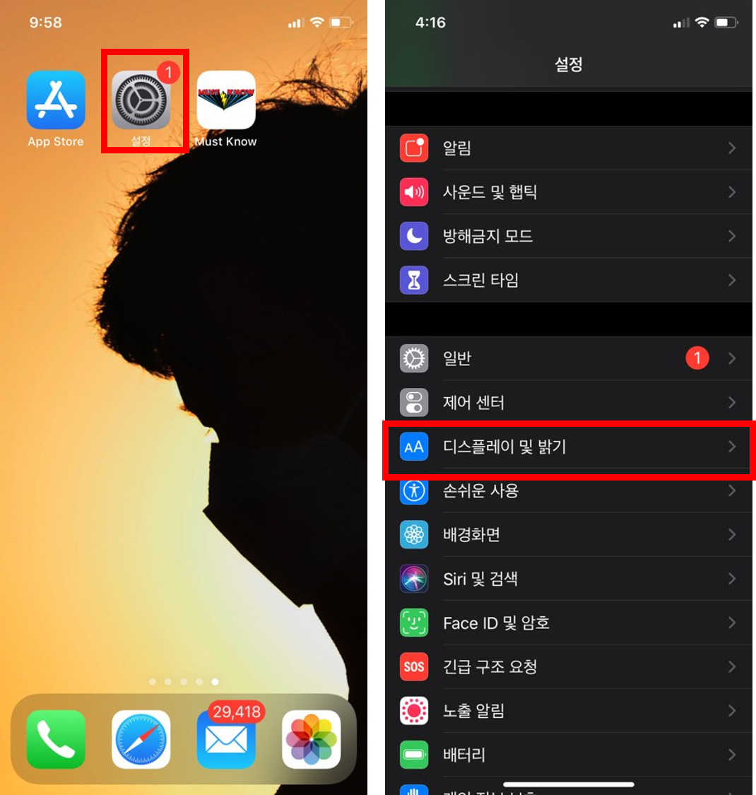 핸드폰 설정에 들어가 우측 사진과 같이 디스플레이 및 밝기를 확인합니다.