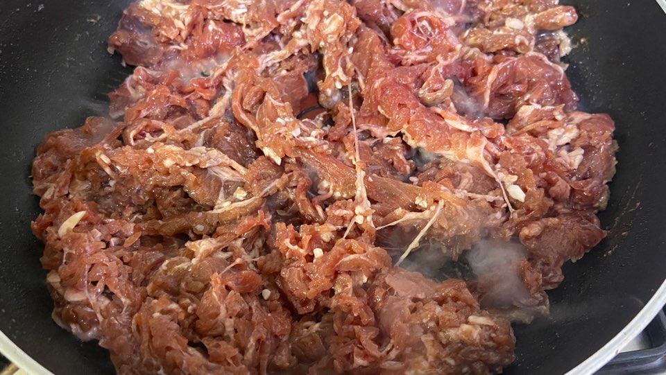 개봉한 불고기를 팬에 올립니다. 팬이 달궈지면서 불고기가 반응을 하며 연기가 올라옵니다.