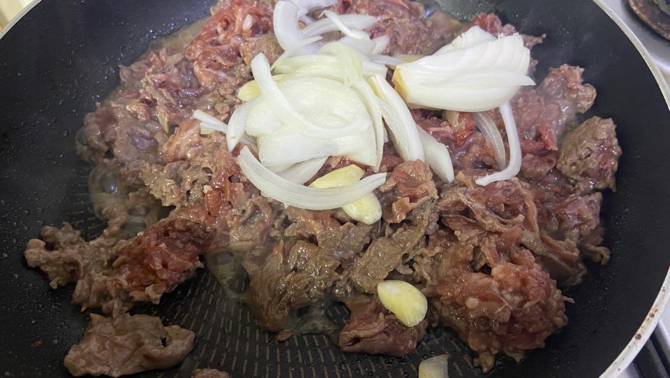 적당하게 한쪽면의 불고기가 익자 양파 한주먹을 팬에 올려 불고기와 함께 볶습니다.