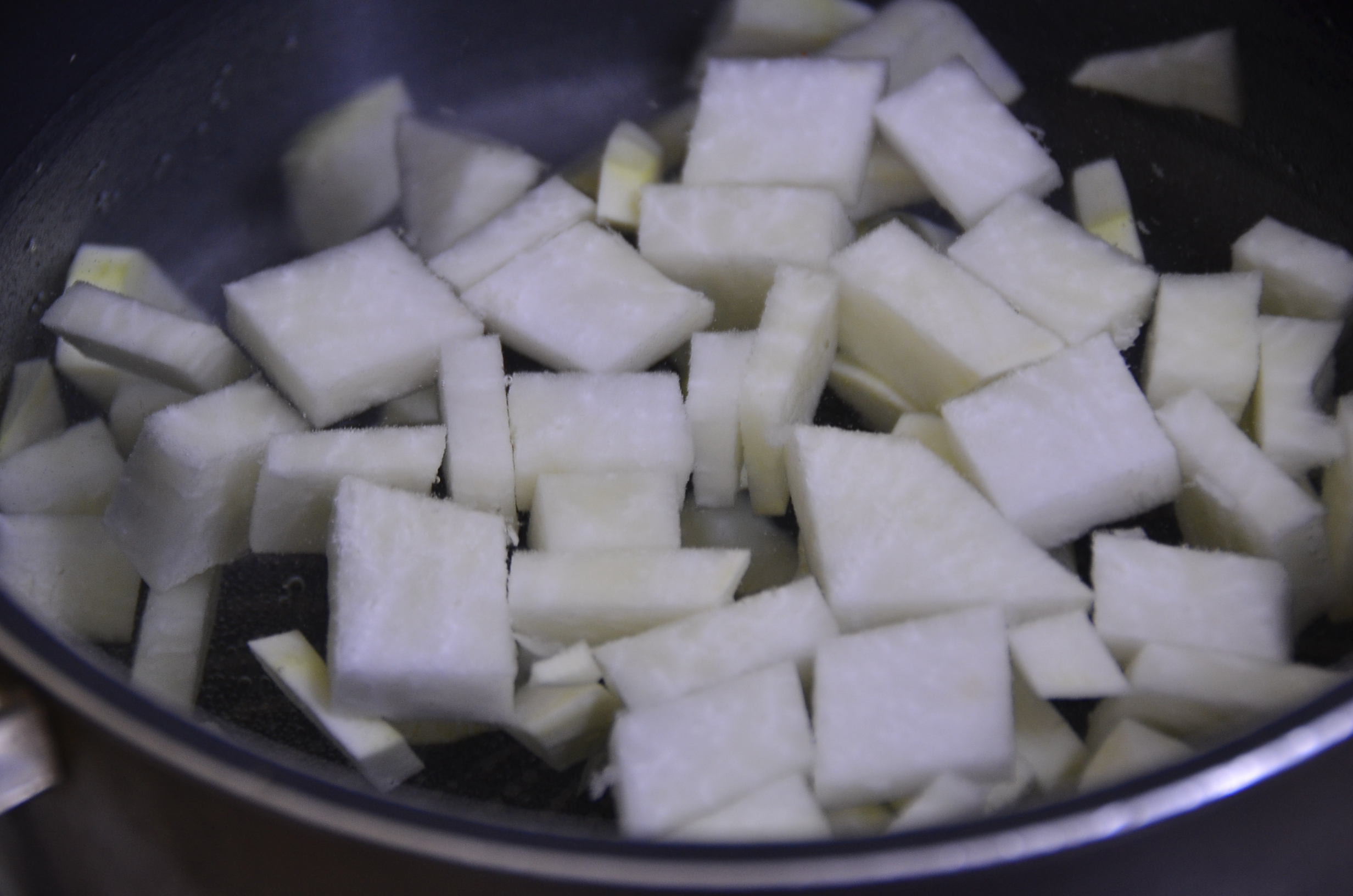 무를 먹기 좋은 크기로 잘라 물에 넣어 제일 먼저 끓여줍니다.