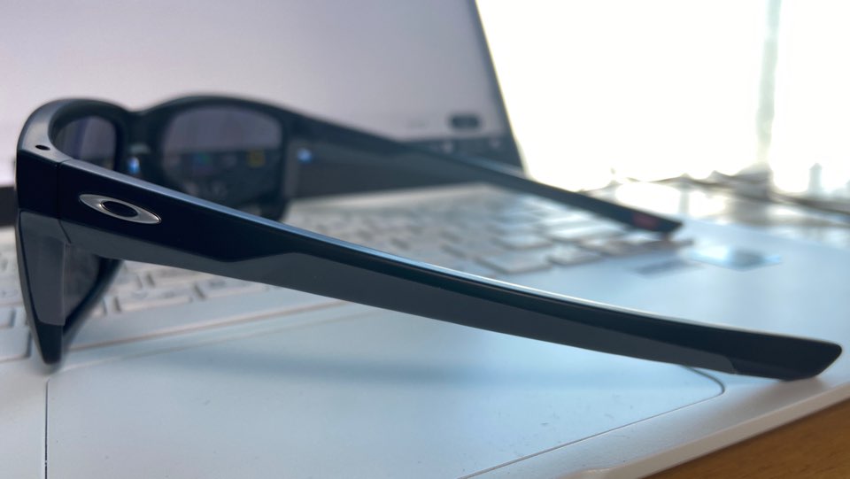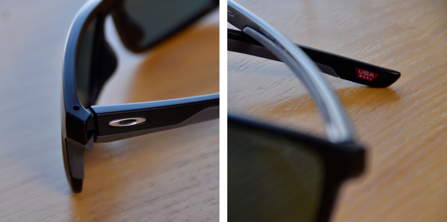 오클리 선글라스 전면 하부에는 PRIZM이라고 마크가 되어 있으며, 오클리의 로고가 프레임에 부착되어있습니다. 프레임 끝에는 제조국이 붉은색으로 표기되어 있네요.
