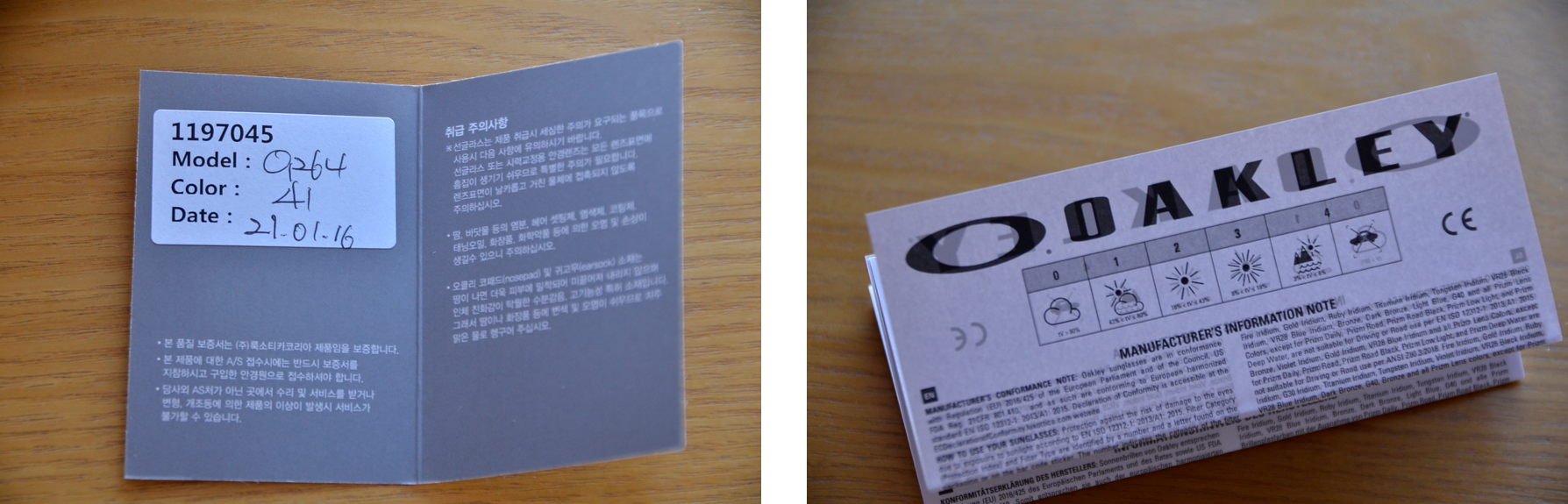 선글라스 케이스 안에는 아래 좌측 사진과 같이 품질 보증서와 제품 설명서가 들어 있습니다.