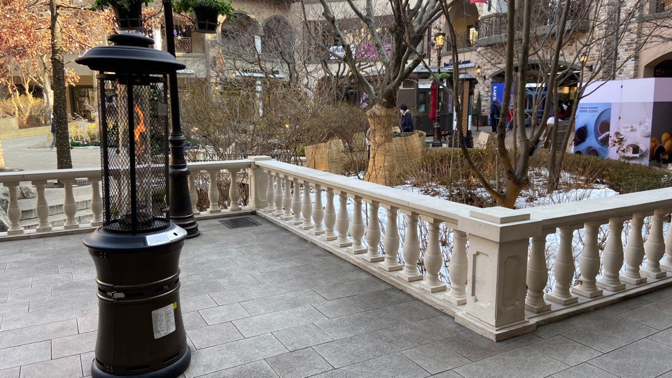 초입 센트럴 가든에는 추운 날씨에 방문한 쇼핑객을 위하여 여러대의 난로를 배치하였습니다.