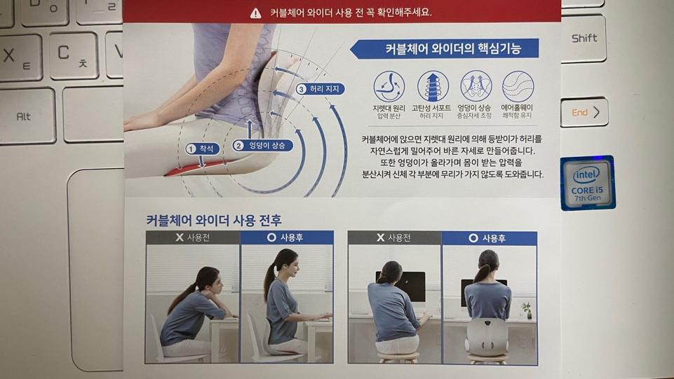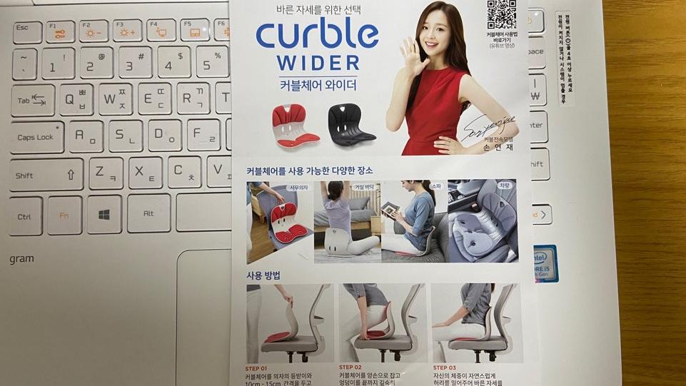 커블체어 와이더 설명서에 있는 사용전후의 비교 사진이 의자의 효과를 바로 예상할수 있게 만들어 줍니다.